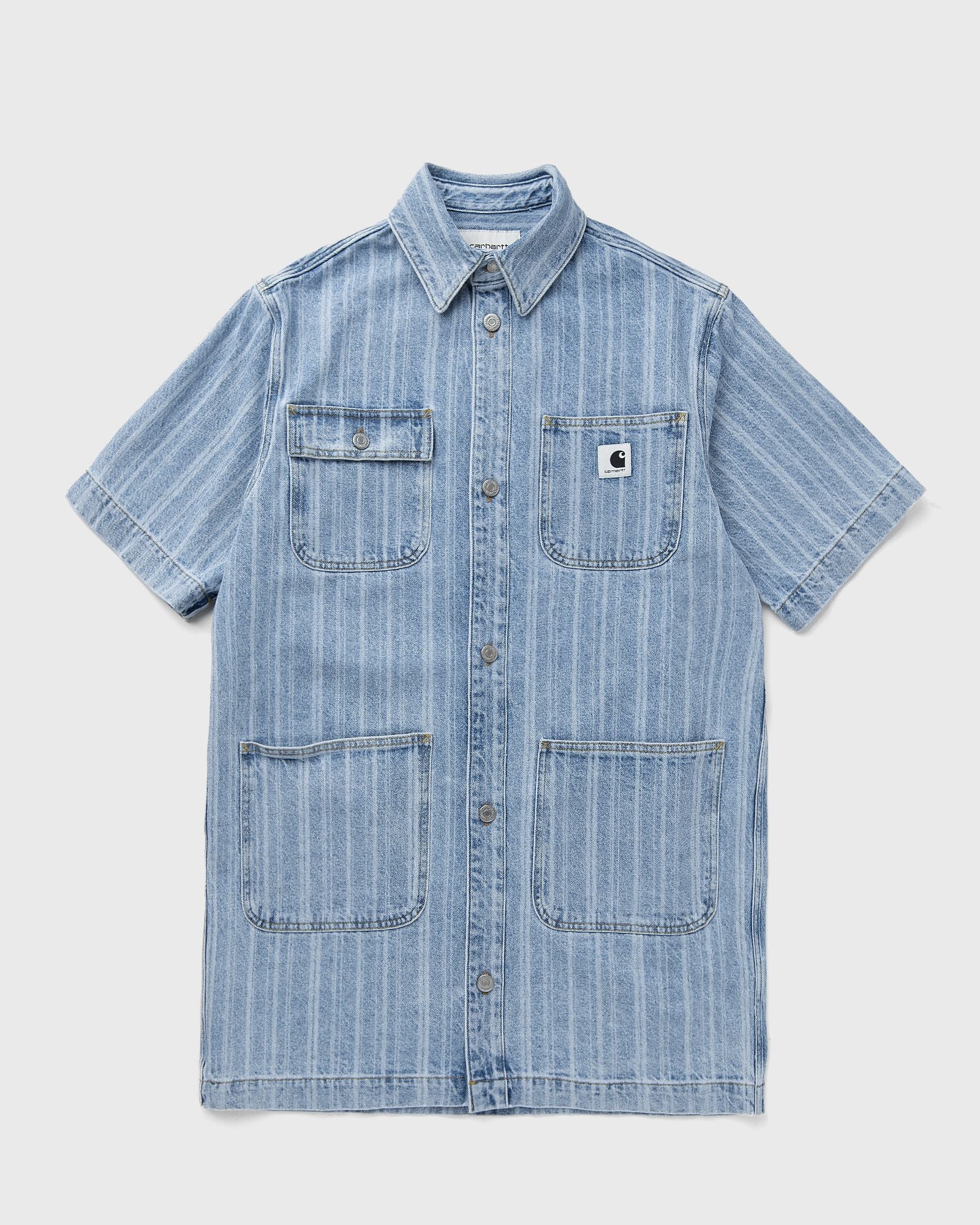 The Carhartt WIP Rylan Dress is made from a heavy cotton denim with stripes. The style is based on the silhouette of a classic chore coat and features four pockets on the front, one of which has a buttoned flap. Bar-tacked seams in frequently exposed areas provide additional robustness. A woven square label rounds off the design. - Two breast pockets, one of which has a flap and button - Bar-tacked seams or rivets in frequently exposed areas - Button placket - Square label