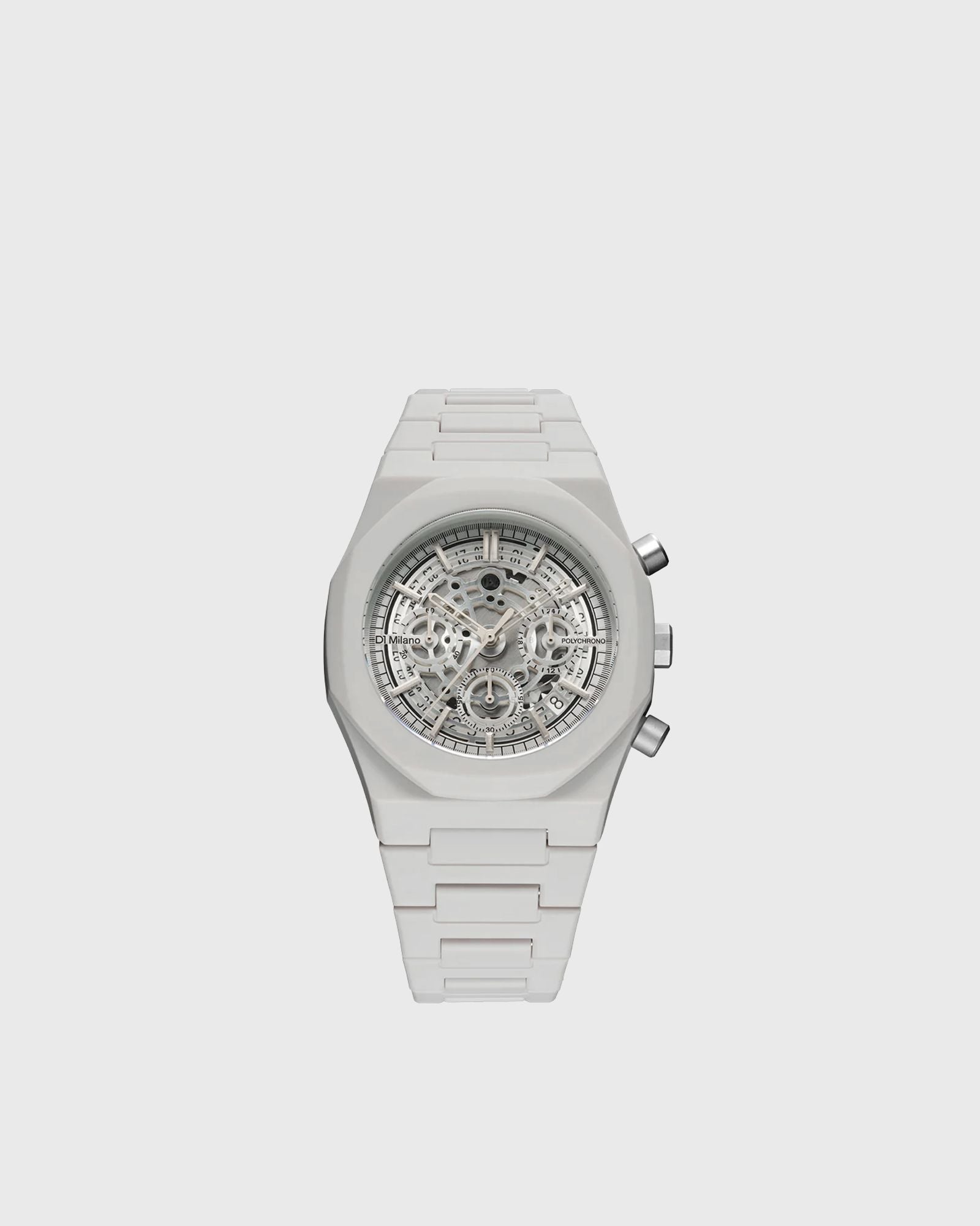 The grey monochrome palette of this D1 Milano watch is enhanced by a skeleton dial that reveals the movement beneath, adding depth and technical appeal. The 40.5 mm case, bezel, and strap are made of ultra-light polycarbonate with a smooth soft-touch finish. - Case size: 40.5 mm - Weight: 55 g - Case material: Grey polycarbonate, soft-touch finish - Strap: Grey polycarbonate, soft-touch finish - Water resistance: 5ATM - Glass: Mineral glass with anti-reflective coating - Movement: TMI VD53C