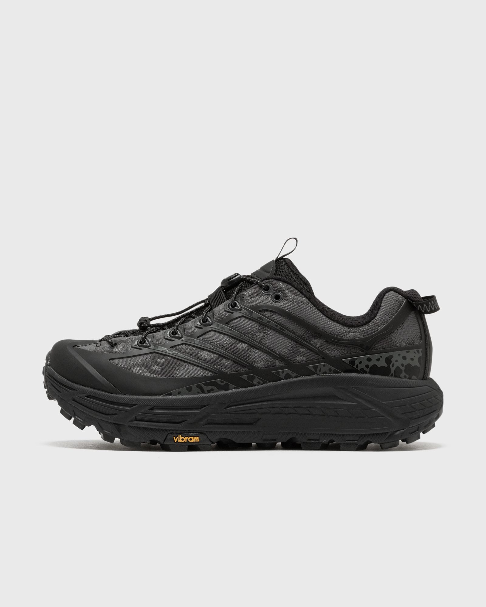 With a curved design inspired by the Year of the Snake, the HOKA One One Stealth/Tech Mafate Three2 is a hyper-modern reinterpretation of the indomitable trail classic. From the functional mesh upper to the raised, textured print on the TPU overlays and raised print details, this trail runner has everything you need for uncompromising off-road performance. - Special mesh upper - Raised, textured print on TPU overlays - Metal eyelets - Molded toe cap - UV print details - Second pair of laces included