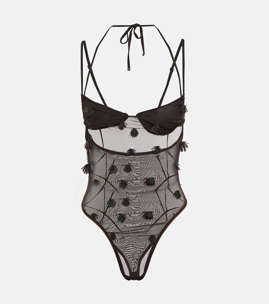 Jacquemus refines designer suits with the Jacquemus Applique mesh bodysuit, a design distinguished by technical performance fabrication and a streamlined foundation silhouette.