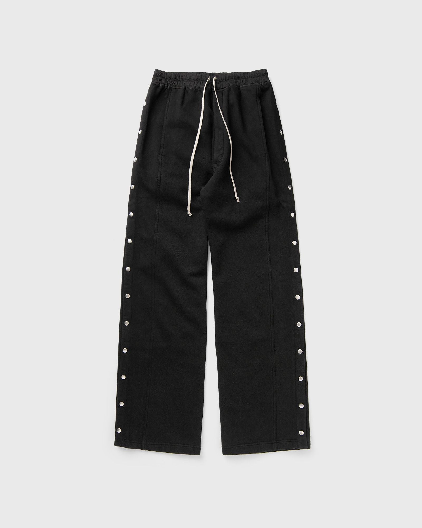 The Rick Owens KNIT SWEAT PANTS - PUSHER PANTS are floor-length, have a wide leg and a slightly flared crotch. The pants have an elastic waistband with drawstring, side pockets at the front and square back pockets with flaps and topstitching. Visible press studs on the outside of the legs, which can be opened and worn open, complete the design. - Elasticated waistband - Side and back pockets - Piece-dyed