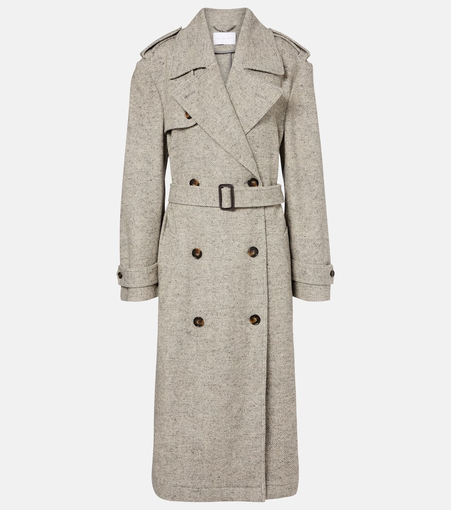 The Stella McCartney Herringbone wool and silk trench coat is expertly crafted using material: 70% wool, 30% silk. care instructions: dry clean. made in hungary. designer color name: grey melange/cream. item color: gray, beige. notched lapel. epaulettes. closure: double-breasted (six buttons). pockets: welt pockets. belt loops. detachable belt. cuff: buttoned. vent: single. unlined. wool, silk. — ensuring durability and an unmistakable touch of elegance. Its meticulous construction speaks to Stella McCartney’s dedication to quality and distinctive design.