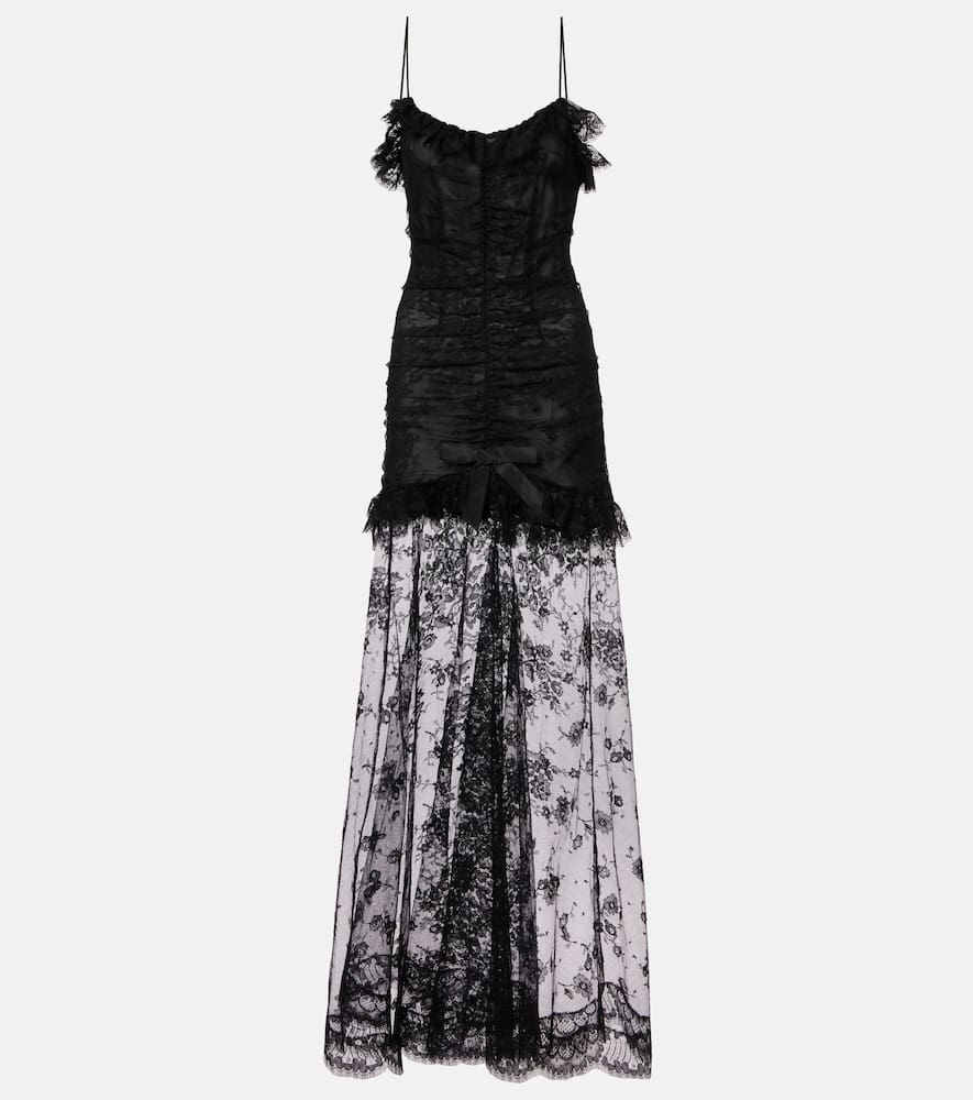 The Alessandra Rich Bow-detail cotton-blend lace gown is expertly crafted using material: 55% cotton, 45% polyamide. care instructions: dry clean. made in italy. designer color name: black. item color: black. lining: 100% silk. material ii: 100% silk. closure: concealed zipper. long vent. cotton. — ensuring durability and an unmistakable touch of elegance. Its meticulous construction speaks to Alessandra Rich’s dedication to quality and distinctive design.