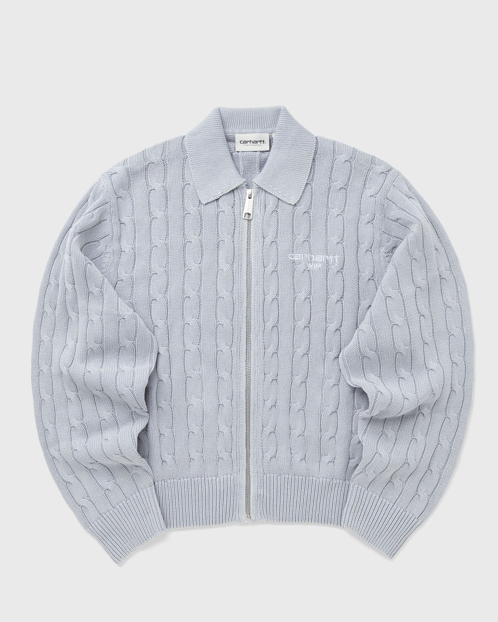 The Carhartt WIP Carter Sweater Jacket is a mid-weight cable knit design made from a cotton yarn. It has been piece-dyed for a softer feel and a more complex colorway. The style is ribbed at the collar, cuffs and hem and fastens with a zipper. There is an embroidered script logo on the chest. - 100% cotton (7 gg) - Zipper - Embroidered script logo