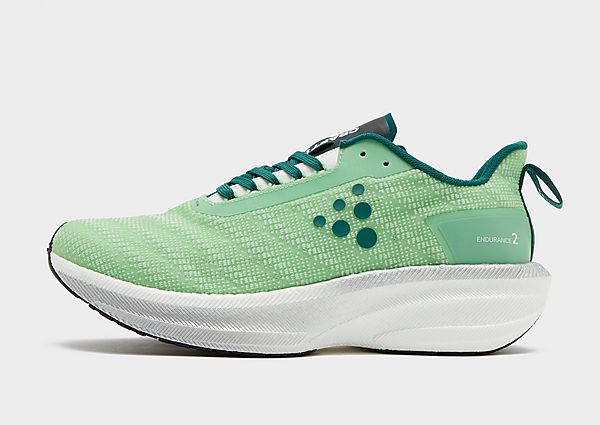 Speed? Distance? These men's Endurance 2 running shoes are built for both. The mesh and synthetic upper is sleek and aerodynamic. A heel tab offers easy entry, while Px Foam underfoot is bouncy for added momentum. Grippy rubber to the outsole brings firm traction. Landing in green and white, they're finished with signature Craft branding.