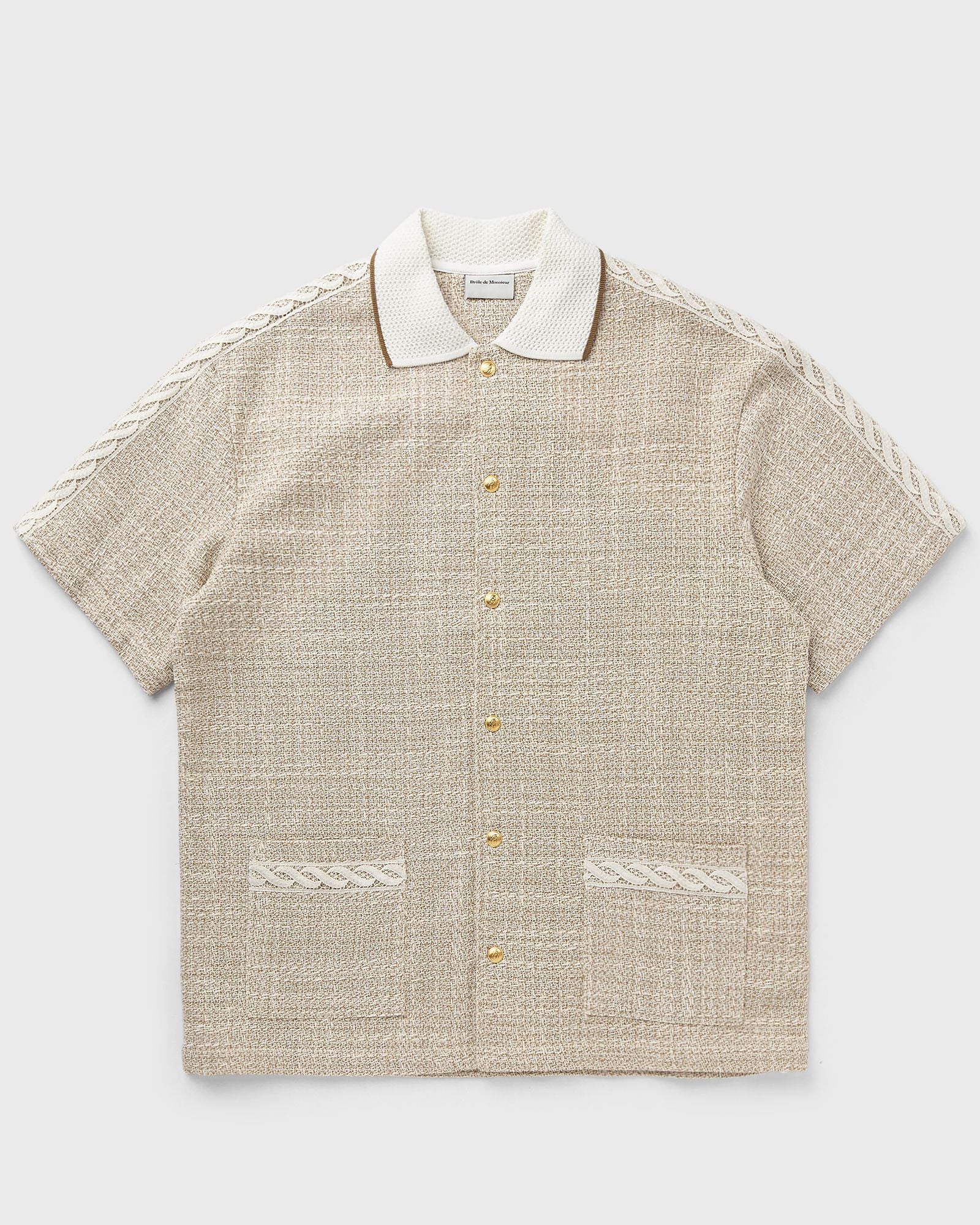 The beige tweed short-sleeved shirt from Drle de Monsieur combines timeless style with modern chic. Made from high-quality tweed, it offers a unique texture and comfortable wear at the same time. Guipure trim on the pockets and along the sleeves as well as the engraved press studs on the front round off the design with an exquisite finish. - Tweed shirt with short sleeves - Knitted mesh collar - Loose fit - Two patch pockets with guipure trim - Engraved press studs on the front