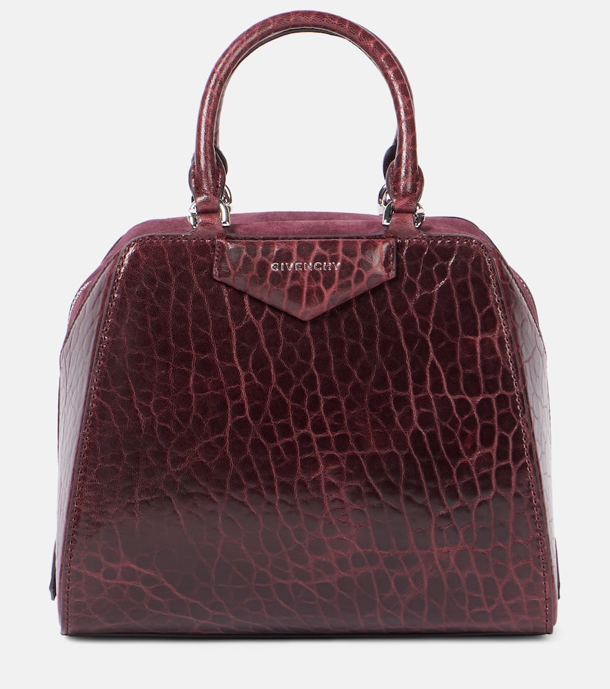 The Givenchy Antigona Cube Mini patent leather tote bag is expertly crafted using material: leather. lining: fabric. made in italy. designer color name: oxblood red. item color: burgundy. internal details: internal slot pockets. closure: two-way zipped top. top handles, detachable shoulder strap. hardware color: silver. — ensuring durability and an unmistakable touch of elegance. Its meticulous construction speaks to Givenchy’s dedication to quality and distinctive design.