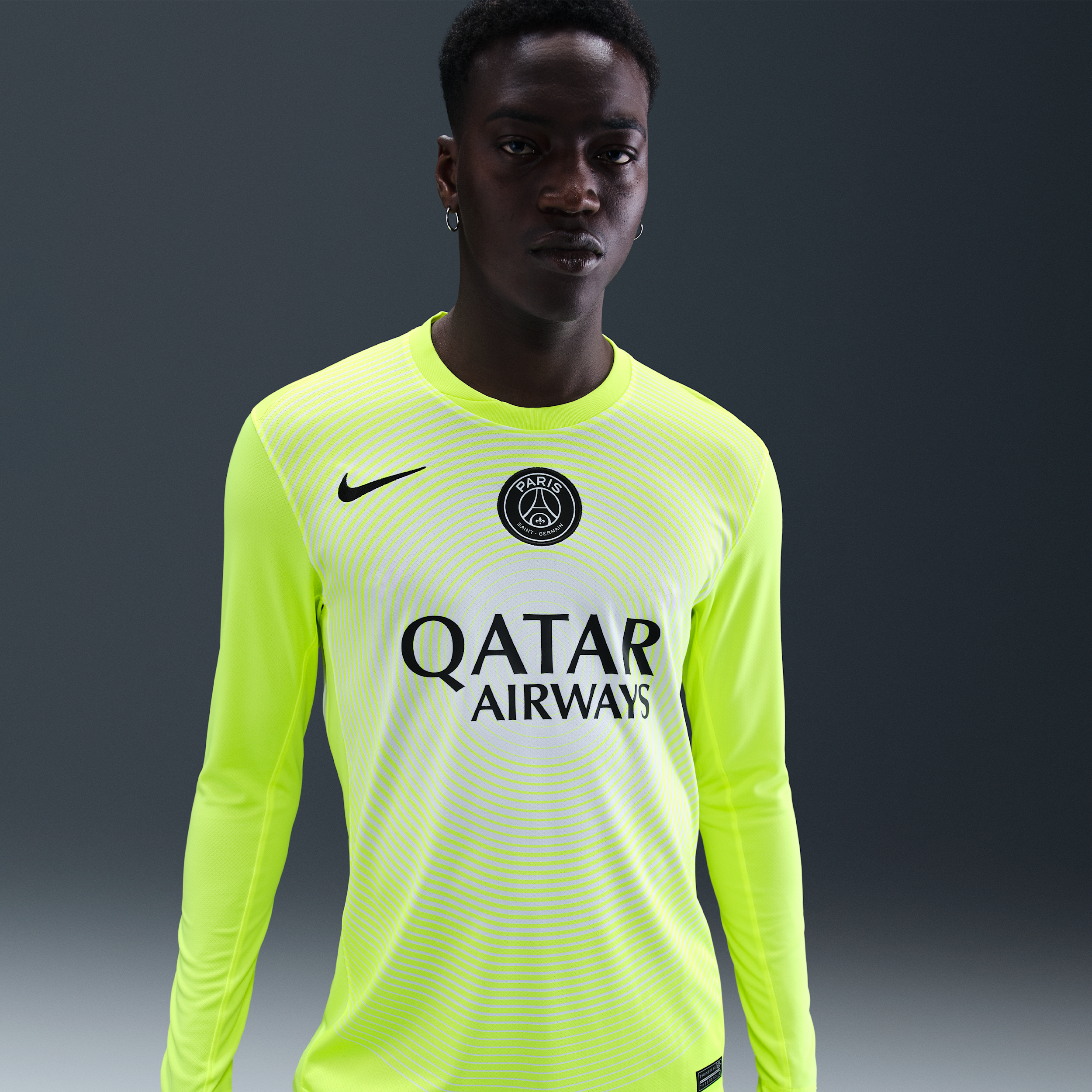 Vístete como el portero de tu equipo favorito con esta réplica del jersey del PSG. Nuestra colección Stadium combina detalles de diseño tipo réplica con tecnología absorbente de sudor para darte un look listo para el partido inspirado en tu equipo favorito. ["Beneficios: La tecnología Nike Dri-FIT absorbe el sudor de la piel para acelerar la evaporación, lo que ayuda a mantener la transpirabilidad y la comodidad. El diseño tipo réplica cuenta con detalles inspirados en lo que usa el equipo."] [] ["Datos del producto: 100% poliéster. Lavar a máquina. Producto importado"] Style: HQ9799; Color: Volt/Blanco/Negro; Size: L; Age Group: Adult | Paris Saint-Germain portero 2025/26 Stadium alternativo
