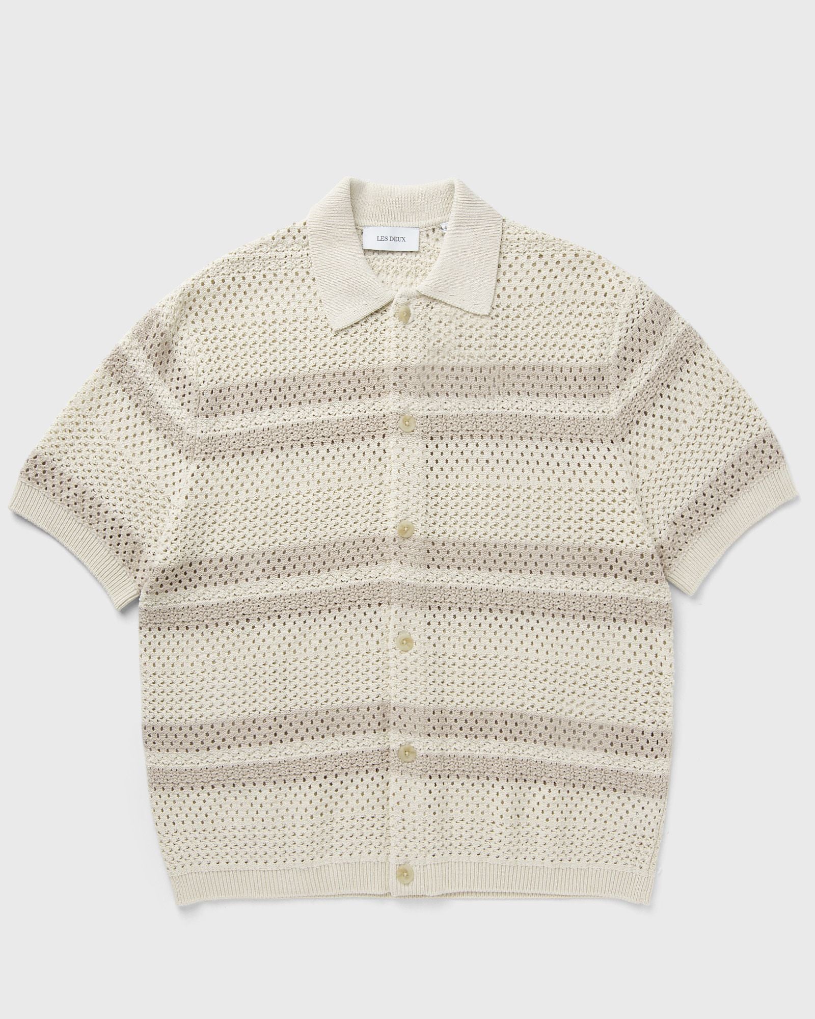 The Les Deux Gianni is a knitted shirt with an openwork pattern that is reminiscent of the nostalgic style of the 70s. A retro stripe pattern rounds off the design. - Openwork, heavy knit - Nostalgic stripe pattern - Ribbed collar and sleeves