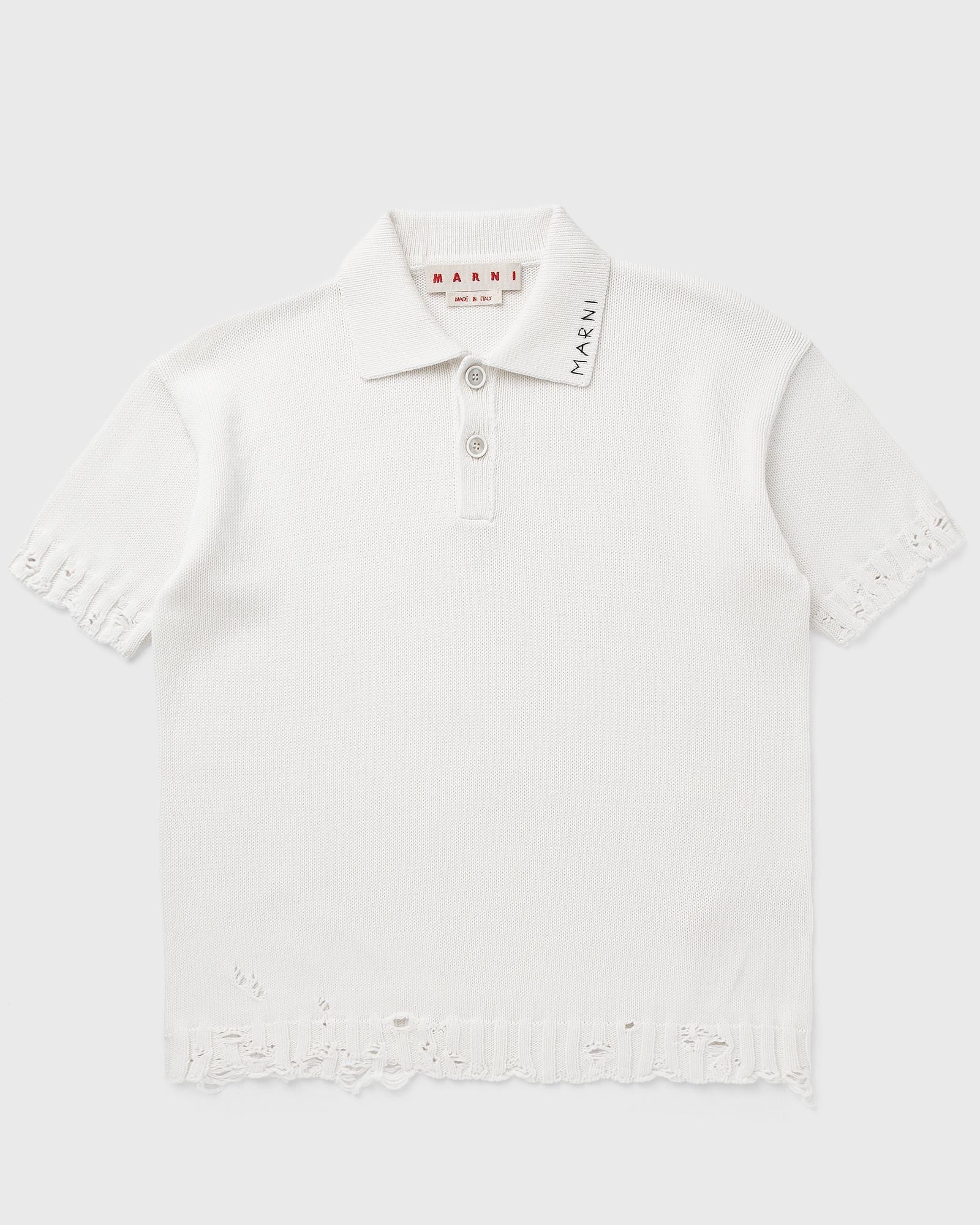 The Marni polo shirt is made from high-quality material and offers comfort and style at the same time. The plain-knit cotton is finished with wide ribbed trims with destroyed details. A hand-embroidered Marni logo on the collar completes the design. - Buttoned polo collar - Destroyed details - Embroidered logo