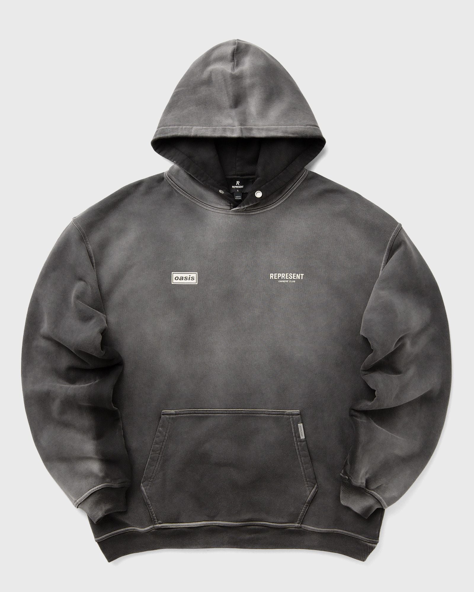 A hoodie with character, created to mark the 30th anniversary of Definitely Maybe. The back features poster-style Oasis band artwork in a tactile print�the poster appears to be peeling away to reveal the iconic Owners' Club branding. The front features a double Oasis box logo print in high density, complemented by the Owners' Club logo. Details such as a Cobrax popper at the hood hem and a metal bar from Represent on the pocket give the hoodie a high-quality finish. - Oversized fit - Poster-style Oasis artwork - Owners' Club branding - Represent metal bar logo