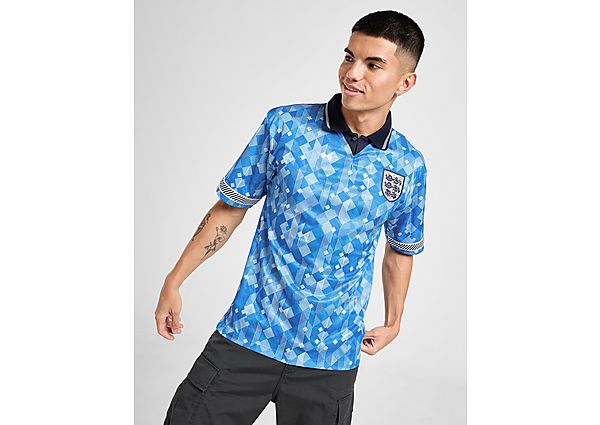 Brought back from the archives, this men's England '90 World Cup Retro Training Shirt from Score Draw is a replica of the shirt the team wore in preparation for the 1990 World Cup. In a blue and white patterned colourway, the lightweight jersey features a spread collar, single button fastening and short sleeves with striped trim. The retro shirt is finished with the iconic England logo embroidered to the chest. | Our model is 6'0" and wears a size medium.