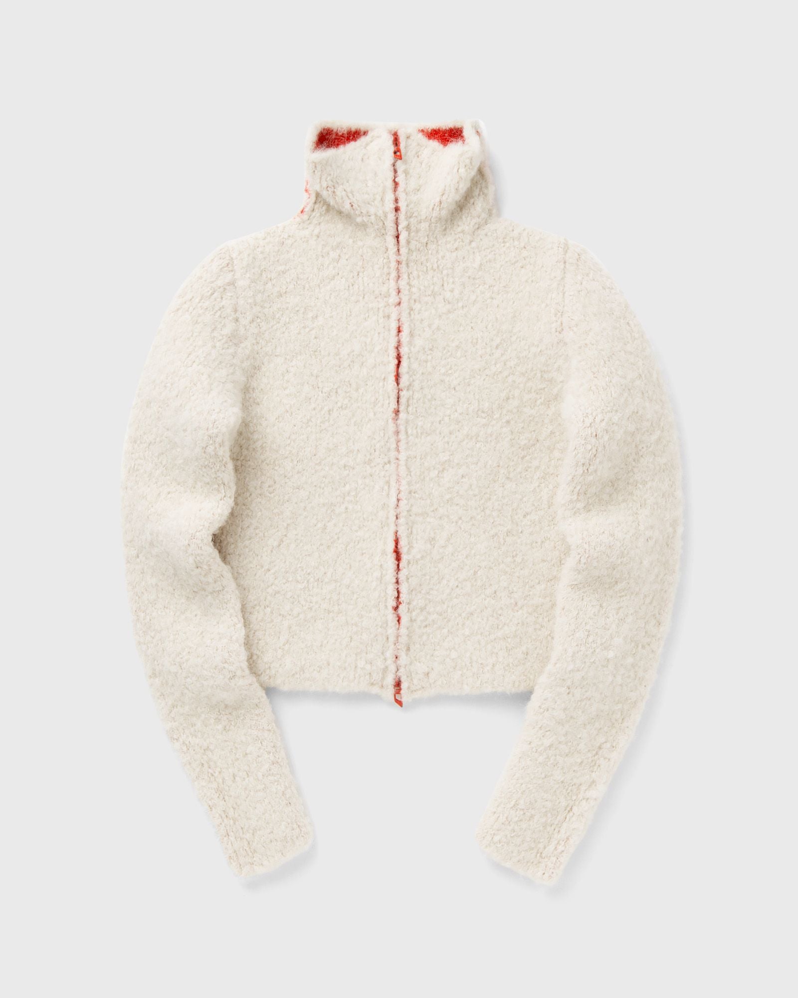 The Diesel M-ELEONERE cardigan combines luxurious alpaca boucl with a contrasting, technically inspired lining. The high collar and slightly cropped cut give it a modern silhouette. With a two-way zipper and D-logo zippers, it is both functional and stylish. - High collar - Full-length zipper - Cropped fit