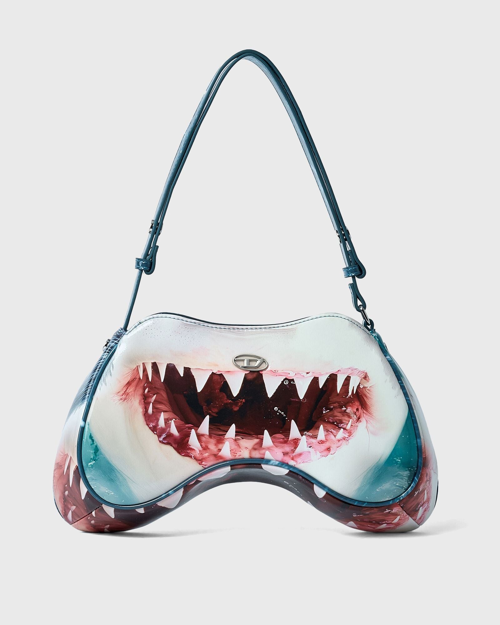 The Diesel PLAY shoulder bag has a distinctive silhouette inspired by video game controllers. This version also features a striking print motif, a glossy finish, and the characteristic oval D logo metal plaque. - Adjustable strap - Zipper closure - Zippered interior pocket - Recycled lining - Dimensions: 19.5 cm x 8 cm x 33 cm