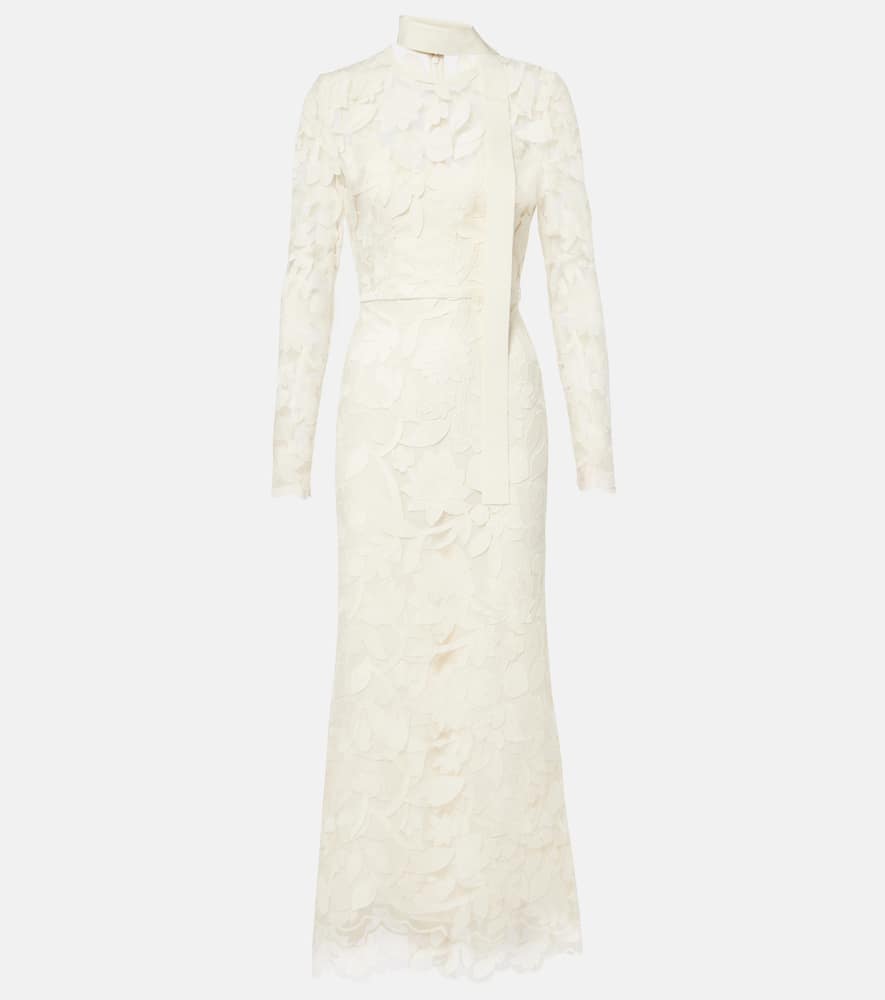 The Elie Saab Floral embroidered tulle midi dress is expertly crafted using material: 57% polyester, 43% silk. care instructions: dry clean. made in lebanon. designer color name: off white. lining: 100% silk. closure: concealed zipper. detachable band. belt loops. — ensuring durability and an unmistakable touch of elegance. Its meticulous construction speaks to Elie Saab’s dedication to quality and distinctive design.
