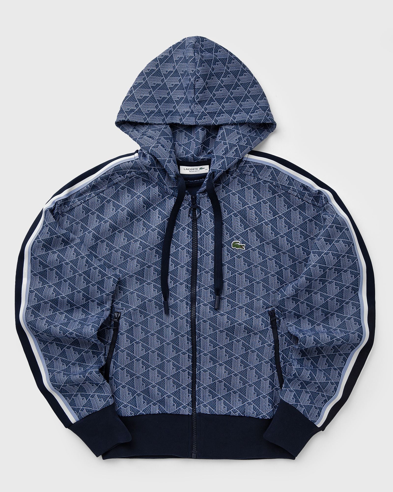 The Lacoste Monogram Hoodie combines urban style with classic brand DNA. With contrasting stripes on the sleeves, an adjustable hood, and a straight regular fit, it offers both comfort and fashionable presence. The full-length zipper, ribbed cuffs, and embroidered crocodile on the chest round out the design. - Adjustable hood - Regular fit, straight cut - Zipper - Ribbed cuffs - Embroidered crocodile on the chest