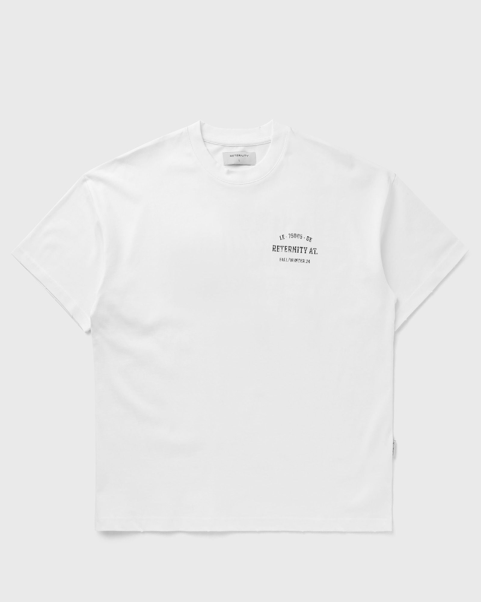 The LE 75005 T-shirt from Reternity has a boxy fit and is made of white cotton. The screen print on the front and back shows an evening scene in a brasserie in the lively 75005 district of Paris, which was hand-drawn by an artist. - 295 g/m cotton, 100% cotton - Screen print on the front and back - Handmade in Europe