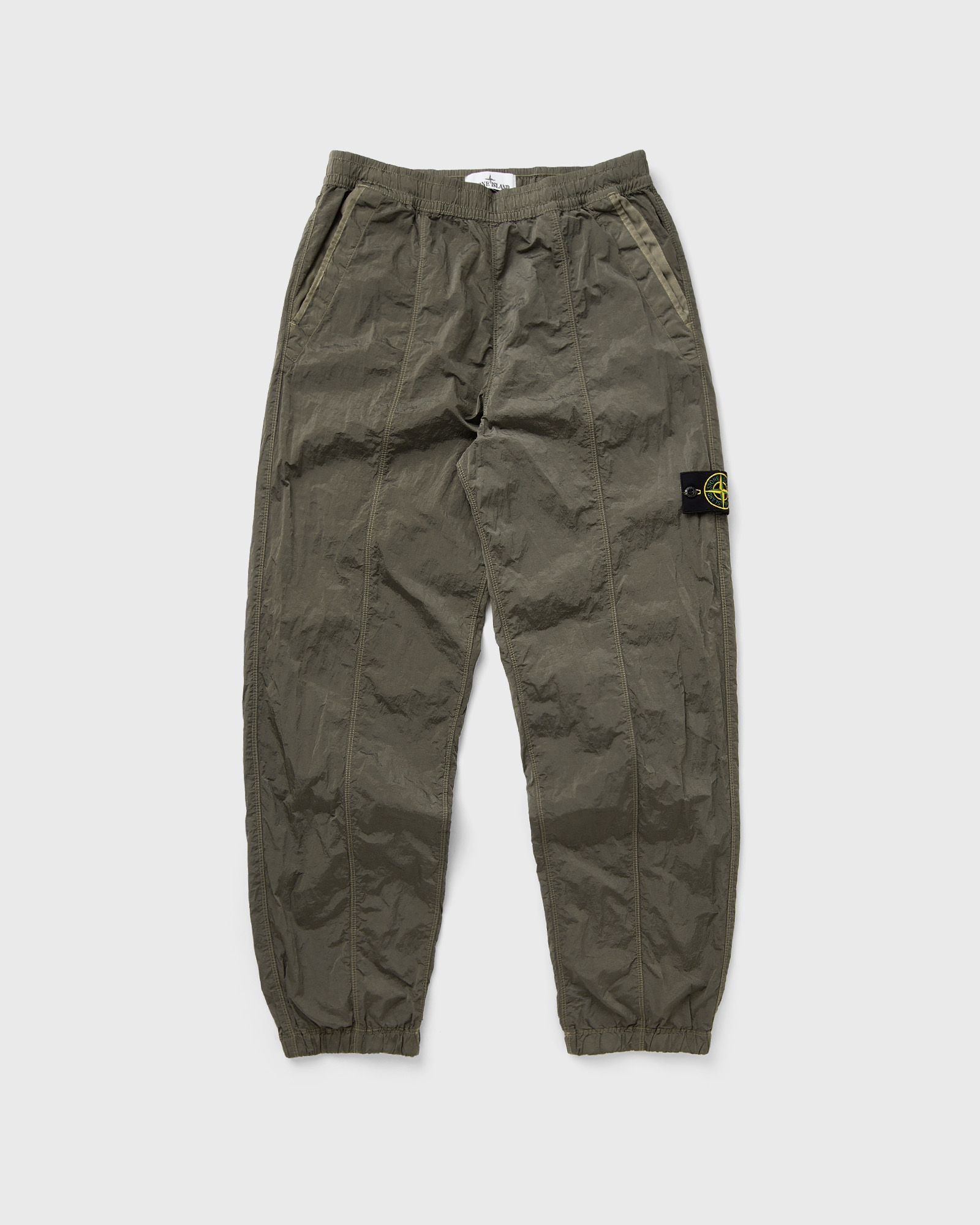 The Loose Fit Jogger Trousers by Stone Island combine sustainable materials with modern design. Made from shimmering nylon metal from ECONYL yarns, they feature contrasting snap button pockets and a breathable mesh lining. The double-color finish achieved through garment dyeing gives the pants a unique, urban look. - Slanted pockets with concealed snap fasteners and contrasting piping - One back pocket with concealed snap fastener - Stone Island emblem on the left leg - Elastic cuffs - Elastic waistband with internal drawstring - Loose fit