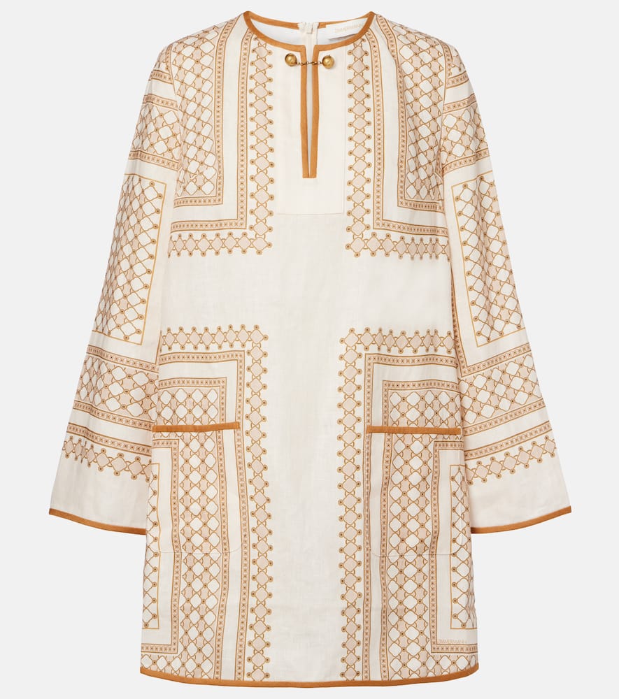 The Zimmermann Printed linen tunic is expertly crafted using material: 100% linen. care instructions: dry clean. made in china. designer color name: cream geo print. item color: white, brown. trim: 100% cotton. closure: zipped back. pockets: patch pockets. — ensuring durability and an unmistakable touch of elegance. Its meticulous construction speaks to Zimmermann’s dedication to quality and distinctive design.