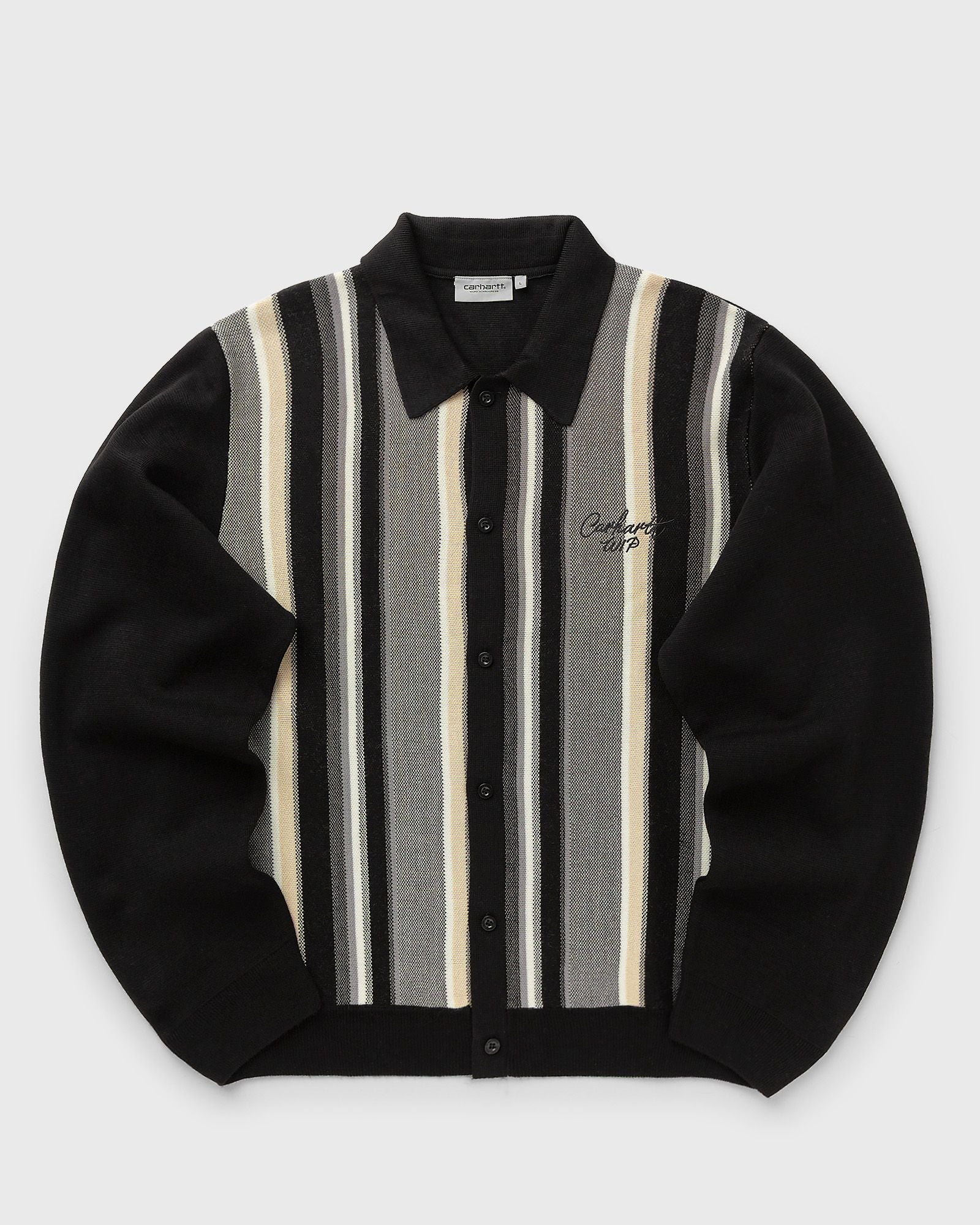 The Bainter Cardigan by Carhartt WIP is a medium-weight knit made from acrylic yarn. The style features a collar, contrasting stripes on the front, and an embroidered graphic on the chest. - 100% acrylic, 12 gg - Button placket - Yarn-dyed - Embroidered graphic