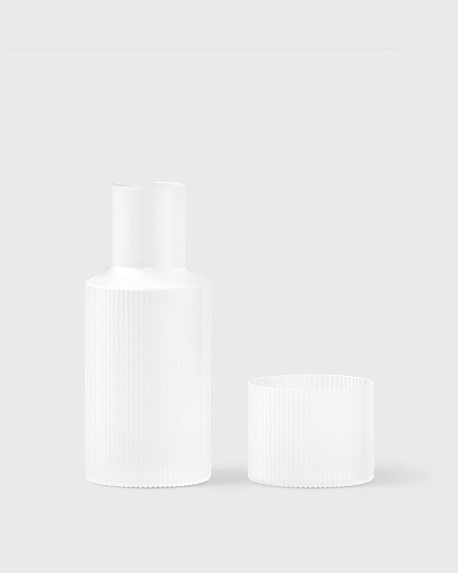 The frosted glass series from Ripple adds a calm, modern touch to the classic ferm LIVING Ripple glass collection. Hand-blown by skilled craftsmen, the pieces retain the characteristic rippled surface and geometric contours and now come in a particularly beautiful frosted glass version. The new color scheme highlights the unique features of each piece and seamlessly blends traditional craftsmanship with modern design. - Carafe dimensions: 7.5cm x 18cm##- Glass dimensions: 6cm x 7.5cm##- Material: Mouth-blown, heat-resistant glass - Product information: Volume carafe: 0.5l, volume glass: 20cl - Care instructions: Dishwasher safe
