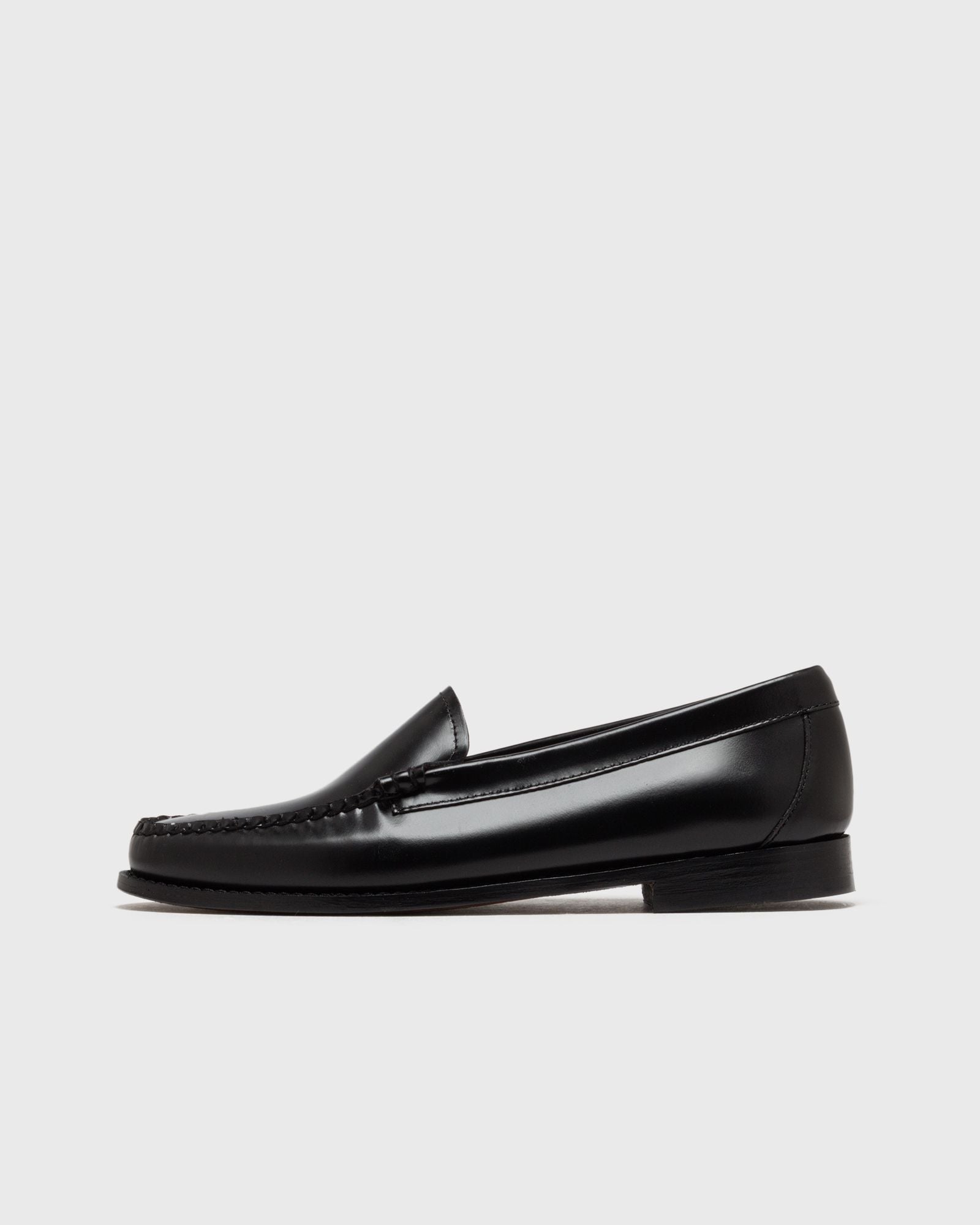 The G.H. BASS Whitney Venetian leather loafers feature a gold sock emblem, an unlined interior for comfort, reliable welt stitching and a sturdy heel on a leather sole with a subtle logo on the bottom sole. The elegant, minimalist loafers are perfect for any environment and can be combined in a variety of ways. - High-quality, handcrafted black moccasin leather - Simple, sleek slip-on design - Gold-colored branding on the insole - Barefoot-friendly unlined interior - 360-degree welt stitching - Reinforced, stacked leather heel - Embossed logo on the undersole - Resoleable leather outsole