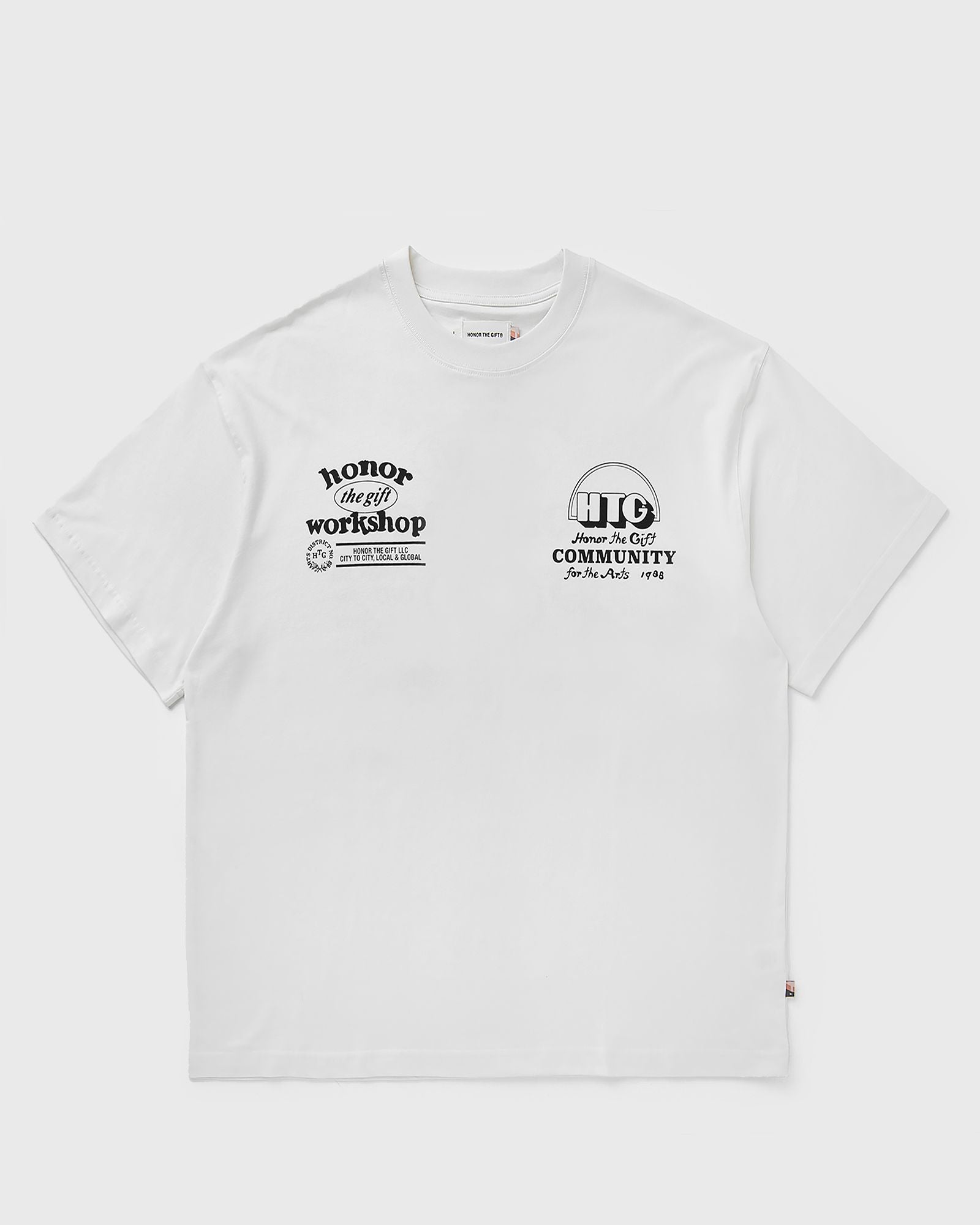 The Honor Workshop Tee from Honor The Gift combines classic streetwear charm with high-quality craftsmanship. Made from 7 oz heavyweight jersey cotton fabric, it offers a robust yet comfortable fit. The shirt features a unique design with graphics on both the front and back. - Ribbed crew neck - Short sleeves - Graphic prints