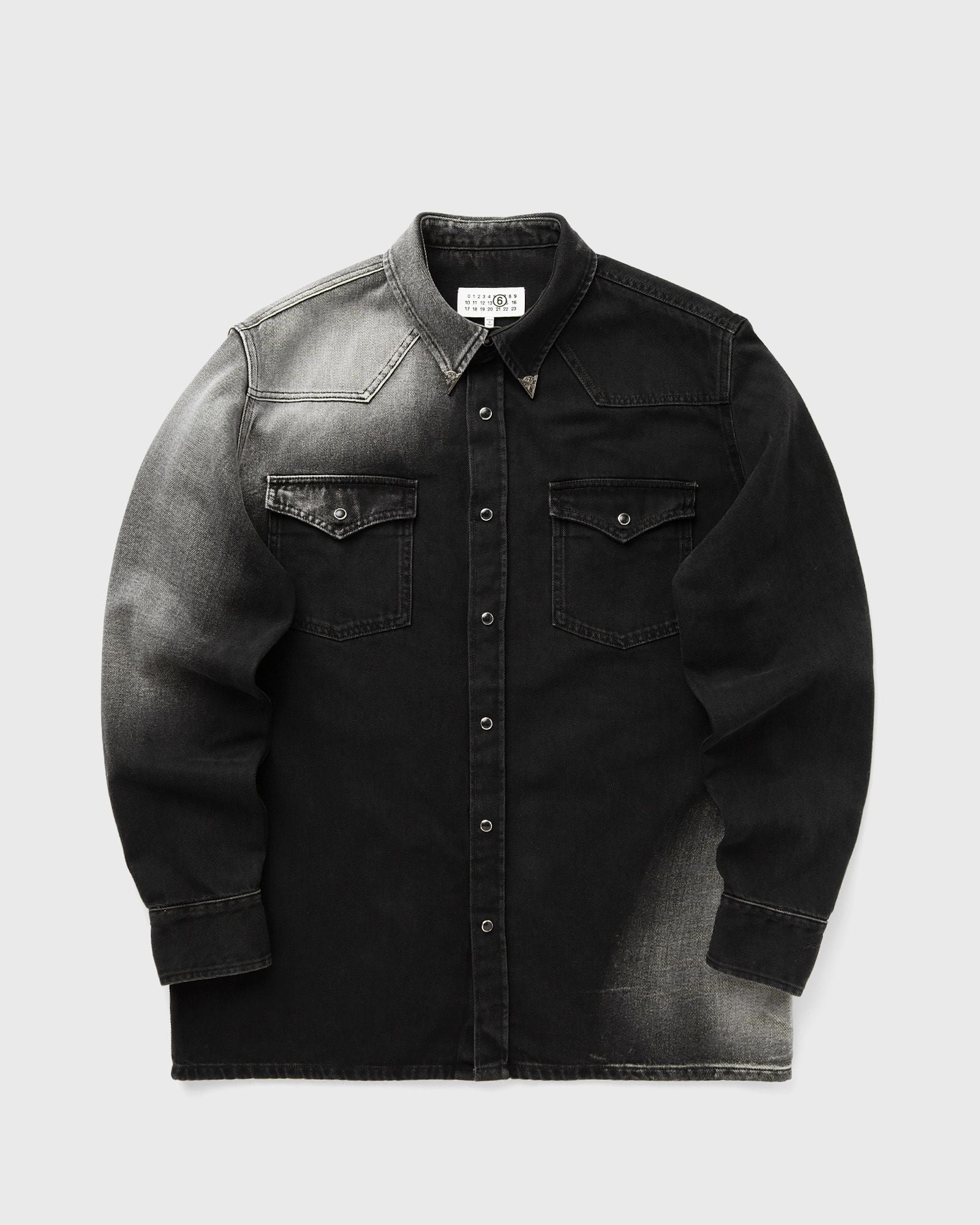 The black denim shirt by MM6 Maison Margiela gives the classic Western silhouette a modern twist. It features tapered yokes, two chest pockets, silver-colored snap buttons, and engraved metal tips on the collar. The faded black wash creates a relaxed structure and soft aesthetic, while white stitching on the back showcases the signature style of the MM6 line. - Western shirt in faded denim - Tapered yokes - Snap button closure - Patch pockets with snap buttons on the chest - Engraved metal tips on the collar - Buttoned cuffs - White stitching on the back - Made in Italy