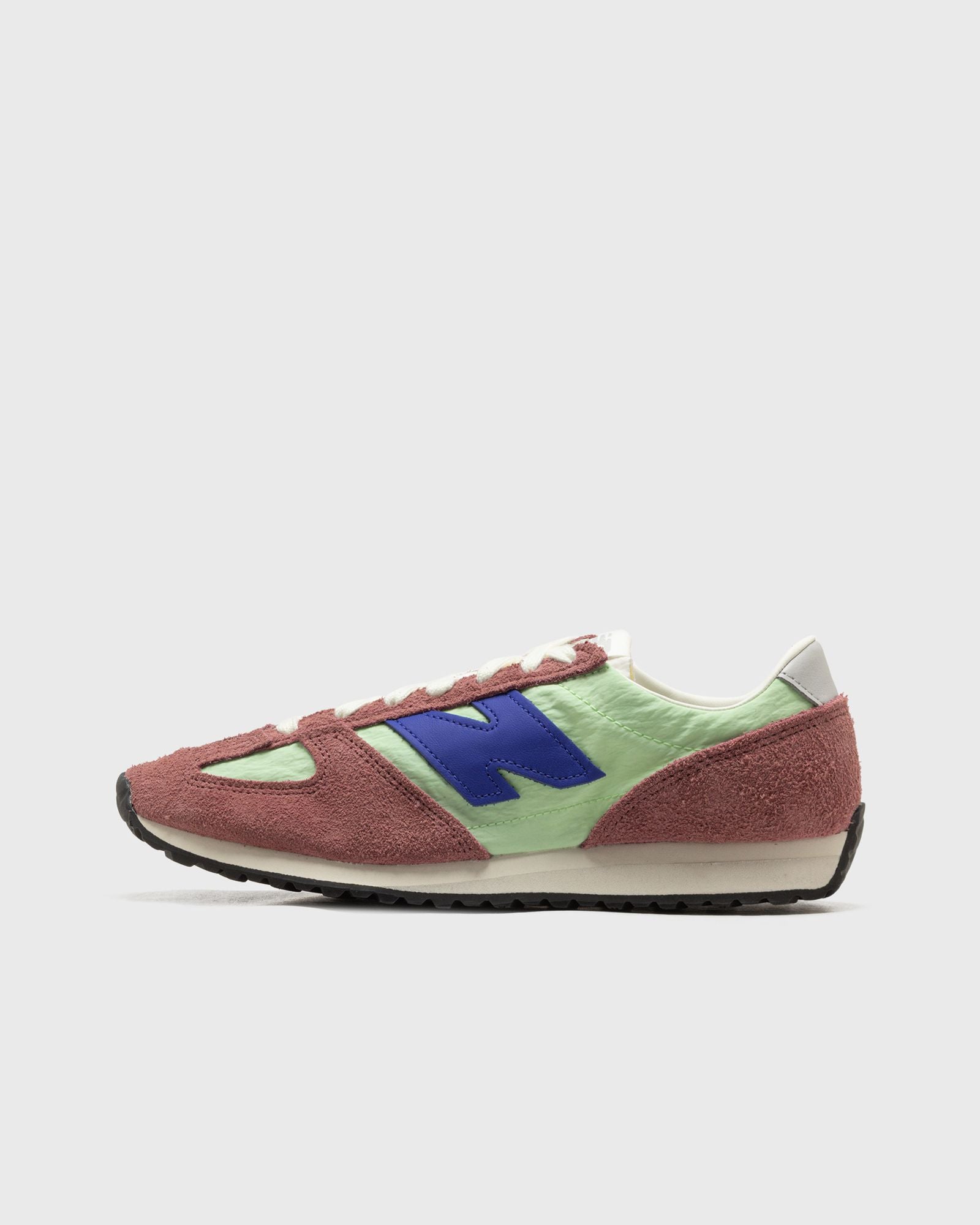 The New Balance 471 reinterprets visual elements from the running tradition of the 70s into a modern style for today. The slim, flat profile, wedge-shaped EVA midsole, and herringbone outsole provide a familiar starting point, allowing the high-quality materials to come into their own. Breathable mesh upper and suede overlays create a relaxed look, while the classic �fang� design on the toe cap is a unique visual feature of New Balance that makes the 471 stand out. - EVA midsole - Leather accents on the collar and heel - Outsole with classic herringbone pattern - Breathable mesh underlays - Suede overlays