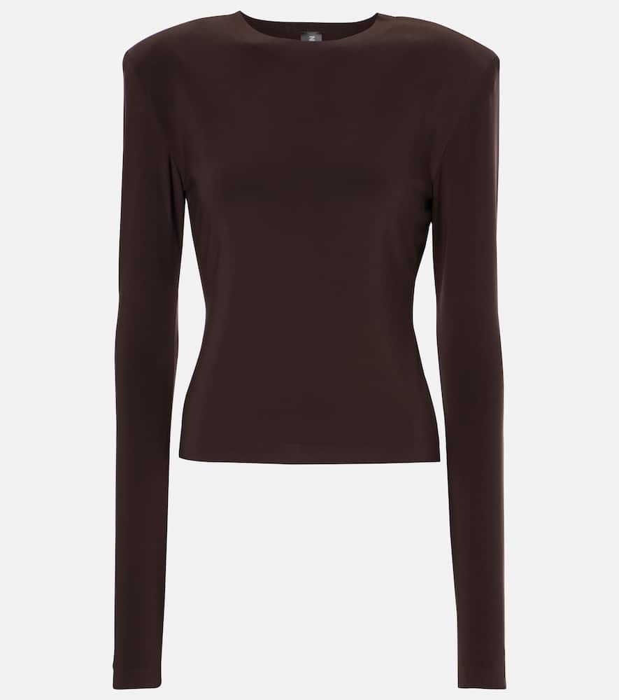 The Norma Kamali Jersey top is expertly crafted using material: 95% polyester, 5% elastane. care instructions: dry clean. made in china. designer color name: chocolate. item color: brown. shoulder pads. — ensuring durability and an unmistakable touch of elegance. Its meticulous construction speaks to Norma Kamali’s dedication to quality and distinctive design.