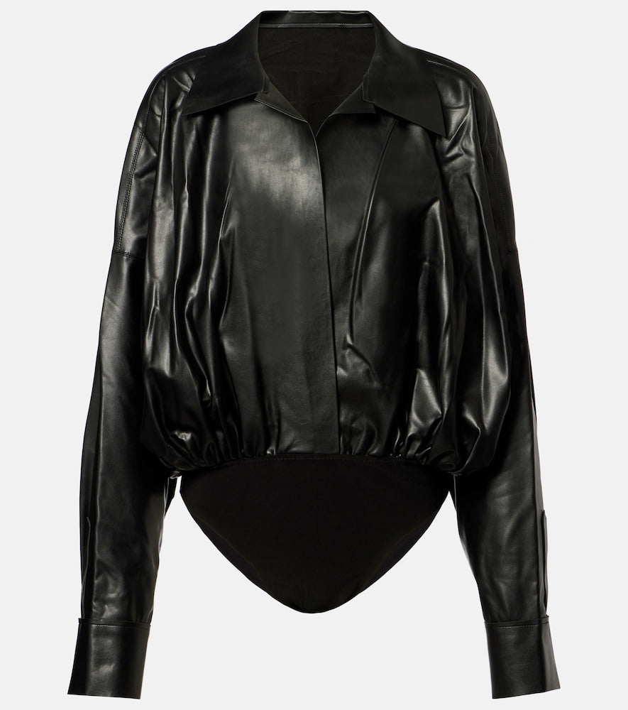The Norma Kamali Oversized bodysuit from Norma Kamali captures the appeal of designer suits with a streamlined foundation silhouette and leather craftsmanship.