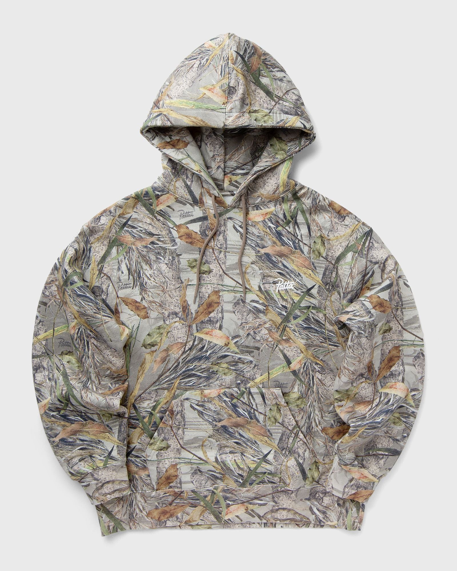 The Patta Nature Print Boxy Hooded Sweater features an all-over camo print that combines leaves and foliage from Africa to create a unique artwork. Made from heavyweight 490 g/m brushed cotton/polyester blend sweat, it has a boxy fit and dropped shoulders. The hoodie features a drawstring hood and a kangaroo pocket on the front as well as a ribbed hem and cuffs. A Patta lettering screen print on the left side of the chest rounds off the design. - Hood with drawstring - Kangaroo pocket - Ribbed cuffs and hem - Logo print