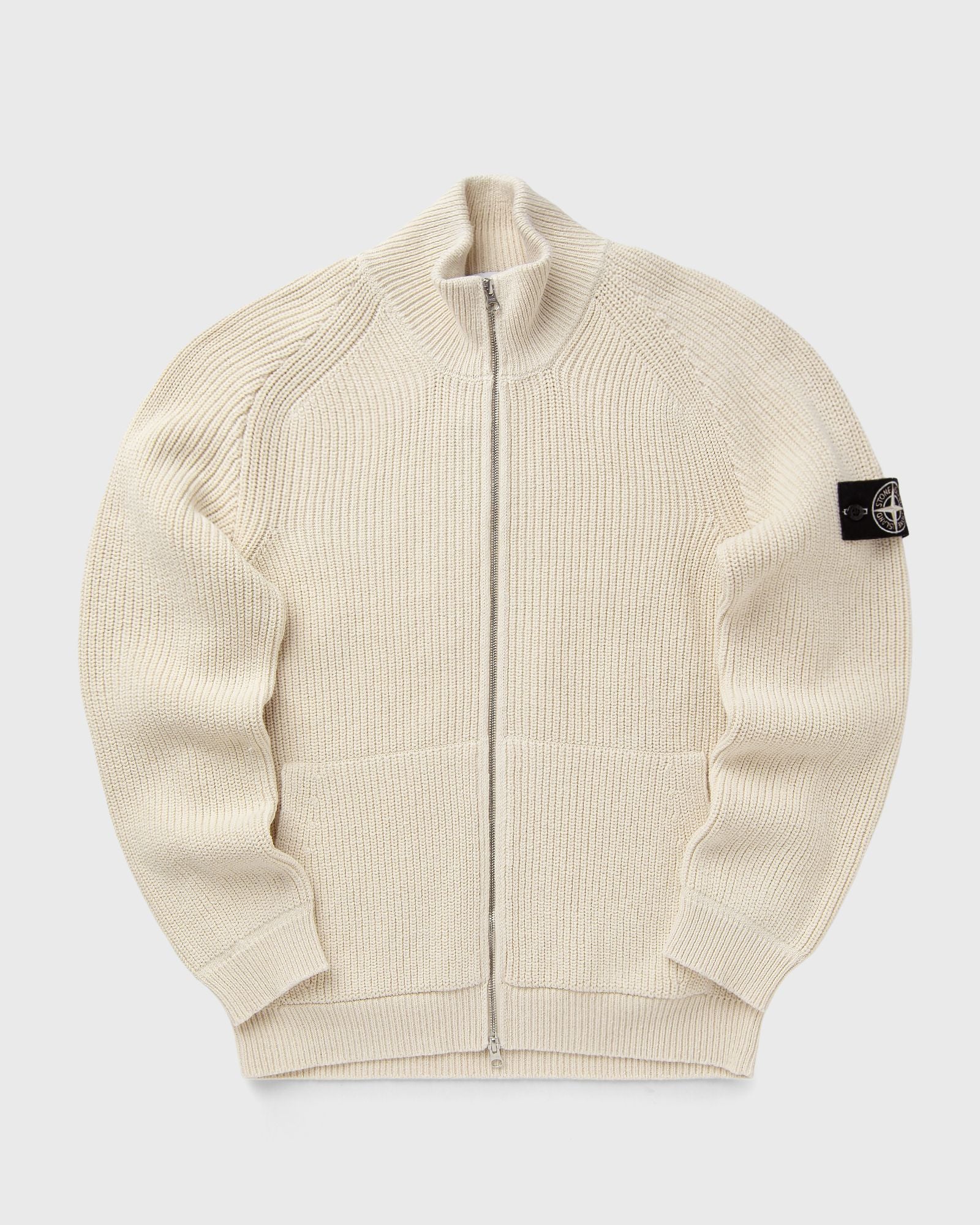 The knitted Stone Island zip-up sweater with pockets and patent pattern is partly made from recycled cotton from an elaborate recycling process in which residual material from the Stone Island production chain is reused. - Ribbed stand-up collar - Raglan sleeves - Vertical side pockets with slanted opening - Stone Island Research badge in white fabric on the left sleeve - Ribbed cuffs and bottom hem - Two-way zip - Loose fit