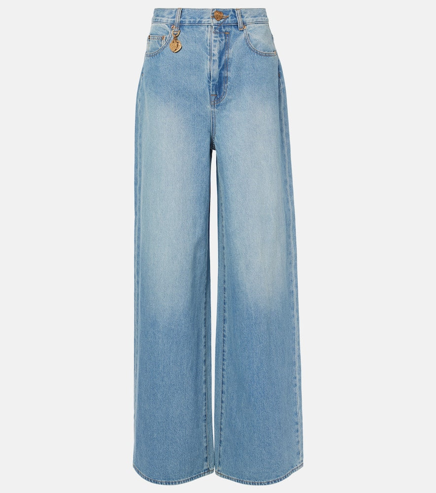 The Zimmermann Crush wide-leg jeans is expertly crafted using material: 100% cotton. care instructions: machine wash at 30 degrees. made in china. designer color name: blue moon. item color: blue. closure: zip and button fastening. pockets: five pockets. belt loops. cotton. — ensuring durability and an unmistakable touch of elegance. Its meticulous construction speaks to Zimmermann’s dedication to quality and distinctive design.