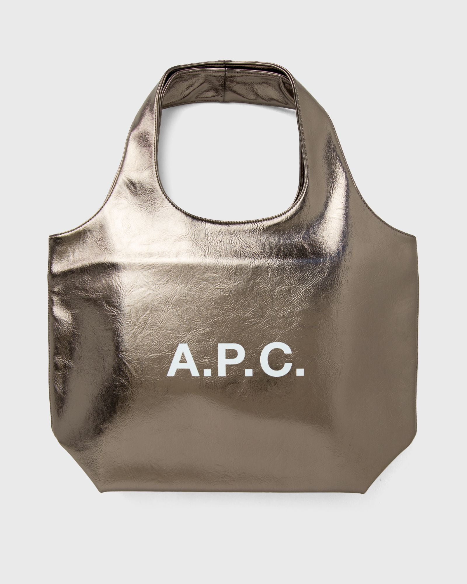 The A.P.C NINON TOTE is a metallic-colored tote bag made from recycled material with a leather look. - Recycled material with a leather look - Two large handles for carrying by hand or on the shoulder - One inner pocket - White A.P.C. logo - Size: 45cm x 35.5cm x 14cm