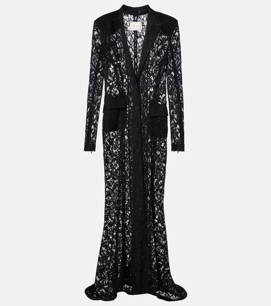 The Blumarine Lace maxi dress is expertly crafted using material: 67% polyester, 33% cotton. care instructions: machine wash at 30 degrees. made in italy. designer color name: black. item color: black. material ii: 100% polyester. closure: partially buttoned front. peak lapel. collar: v-neck. shoulder pads. cuff: zipped. pockets: flap pockets. hem: uneven. unlined. cotton. — ensuring durability and an unmistakable touch of elegance. Its meticulous construction speaks to Blumarine’s dedication to quality and distinctive design.