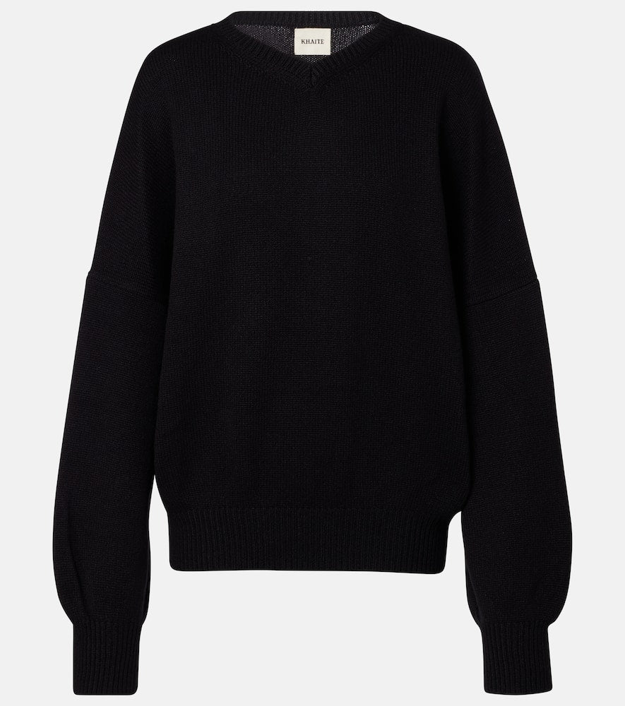 The Khaite Wolfe cashmere sweater is expertly crafted using material: 100% cashmere. care instructions: dry clean. made in italy. designer color name: black. item color: black. cuff: ribbed. hem: ribbed. cashmere. — ensuring durability and an unmistakable touch of elegance. Its meticulous construction speaks to Khaite’s dedication to quality and distinctive design.