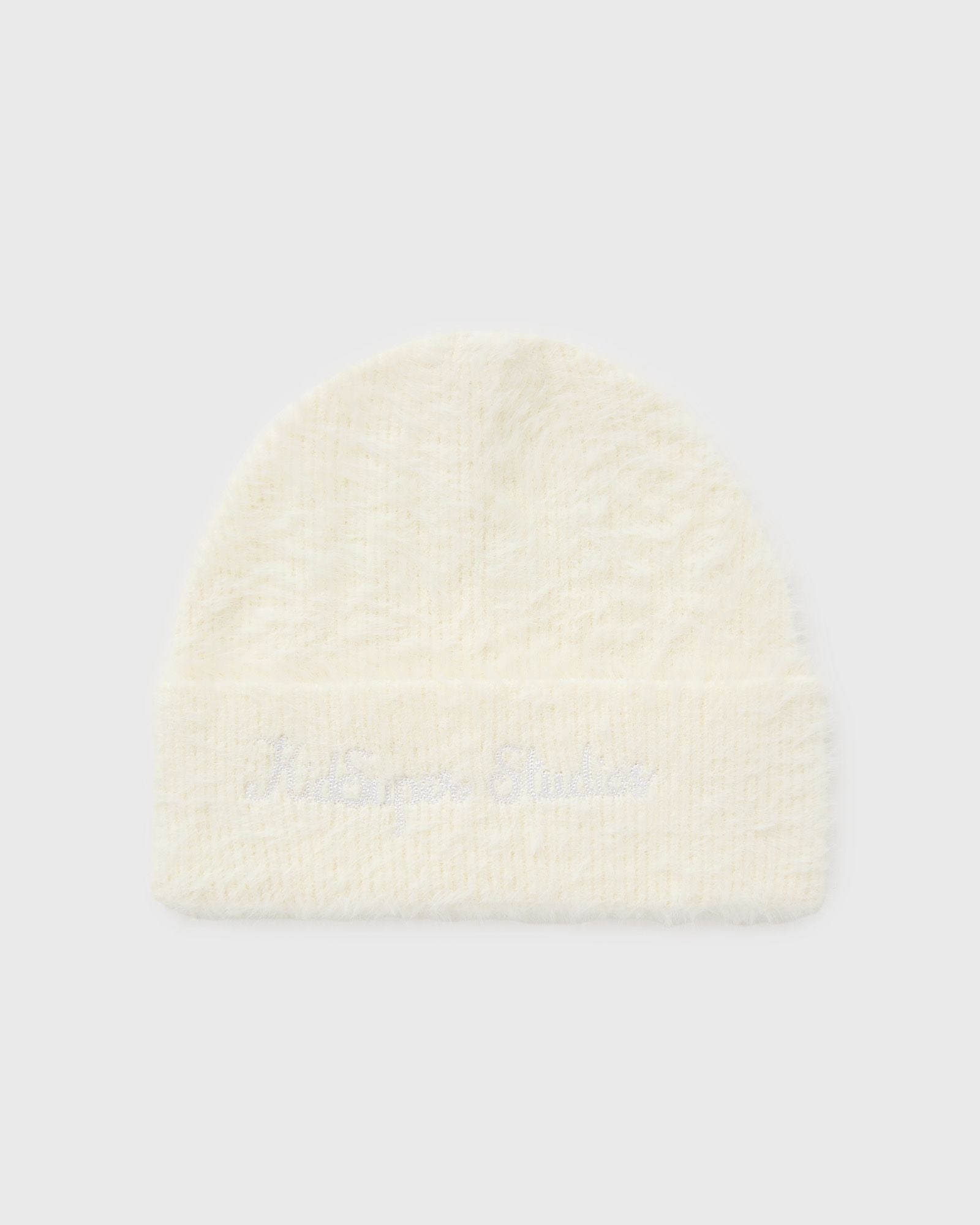 The Fuzzy Knit Beanie from KidSuper is made from a fluffy fabric with a soft feel and is decorated with chain stitch embroidery on the front. - Soft, fluffy material - Chain stitch embroidery