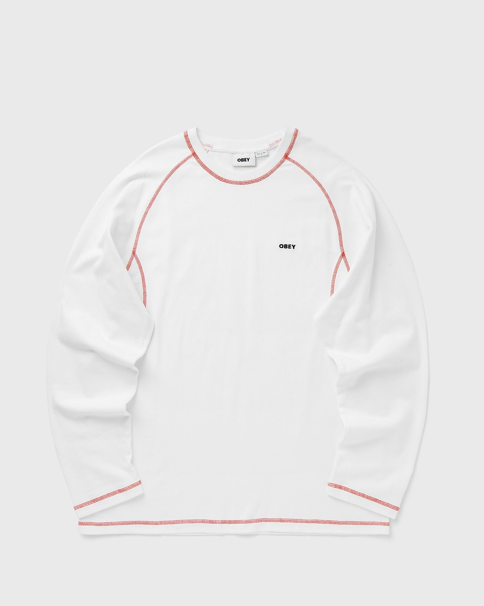 The Aaron Contrast Stitch Longsleeve Shirt by OBEY combines a clean white tone with striking contrasting red stitching. The relaxed fit ensures comfortable wear, while the ribbed collar and chest embroidery add subtle details. - Ribbed crew neck collar - Contrasting stitching - Logo embroidery