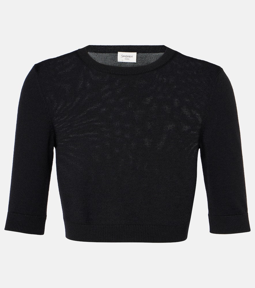 Material: 100% wool. Care instructions: dry clean. Made in Italy. Designer color name: Noir. Collar: crewneck. Sleeves: short-sleeved. Length: cropped. Wool.