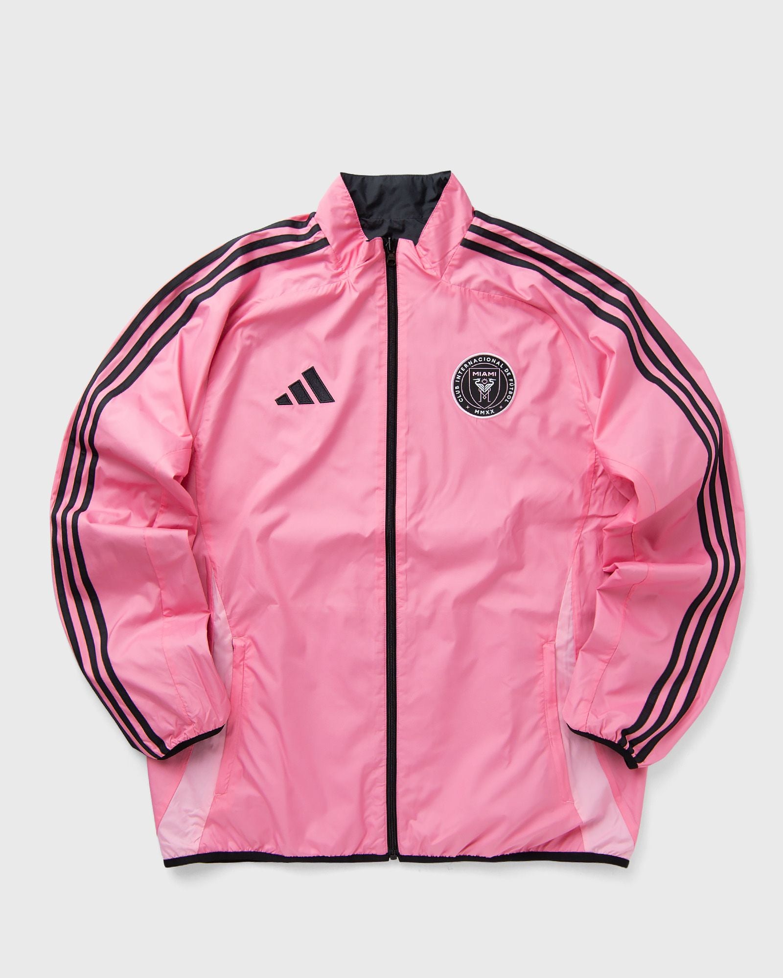 The adidas Inter Miami CF Anthem Jacket is designed with a smooth ripstop fabric and a slim fit. The reversible design allows players and fans to show their club loyalty in both home and away colors. - Slim fit - Full-length zipper - Lined - Inter Miami CF woven crest