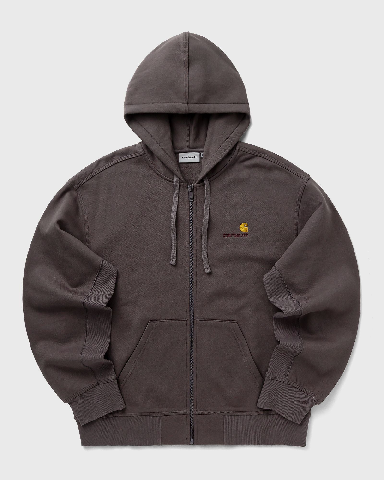 The loose-fitting Hooded American Script Jacket by Carhartt WIP is made from heavy polyester-cotton jersey that has been brushed for a fleece-like interior. It features an adjustable hood, a zipper, and a split kangaroo pocket. An American Script logo on the chest completes the design. - Full-length zipper - Split kangaroo pocket - Adjustable hood