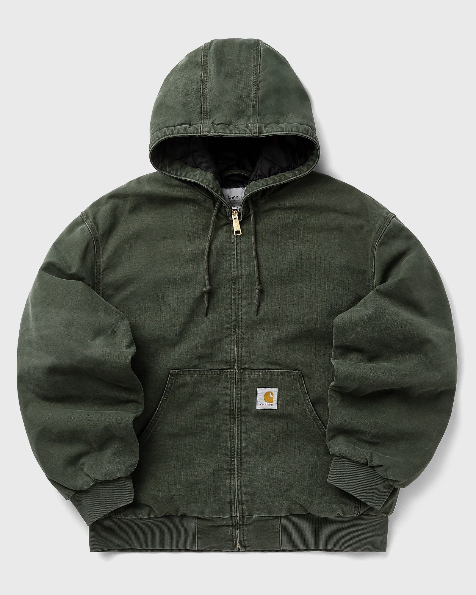The OG Active Jacket by Carhartt WIP is made from 340g Dearborn canvas in organic cotton. The jacket is a heavyweight, heat-insulating style with a relaxed fit and features a quilted lining, ribbed hem, and cuffs. A kangaroo pocket, adjustable hood, and zipper provide functional details, while triple stitching adds extra stability. - Original loose fit - Quilted lining - Triple stitching - Square label - Stone canvas wash