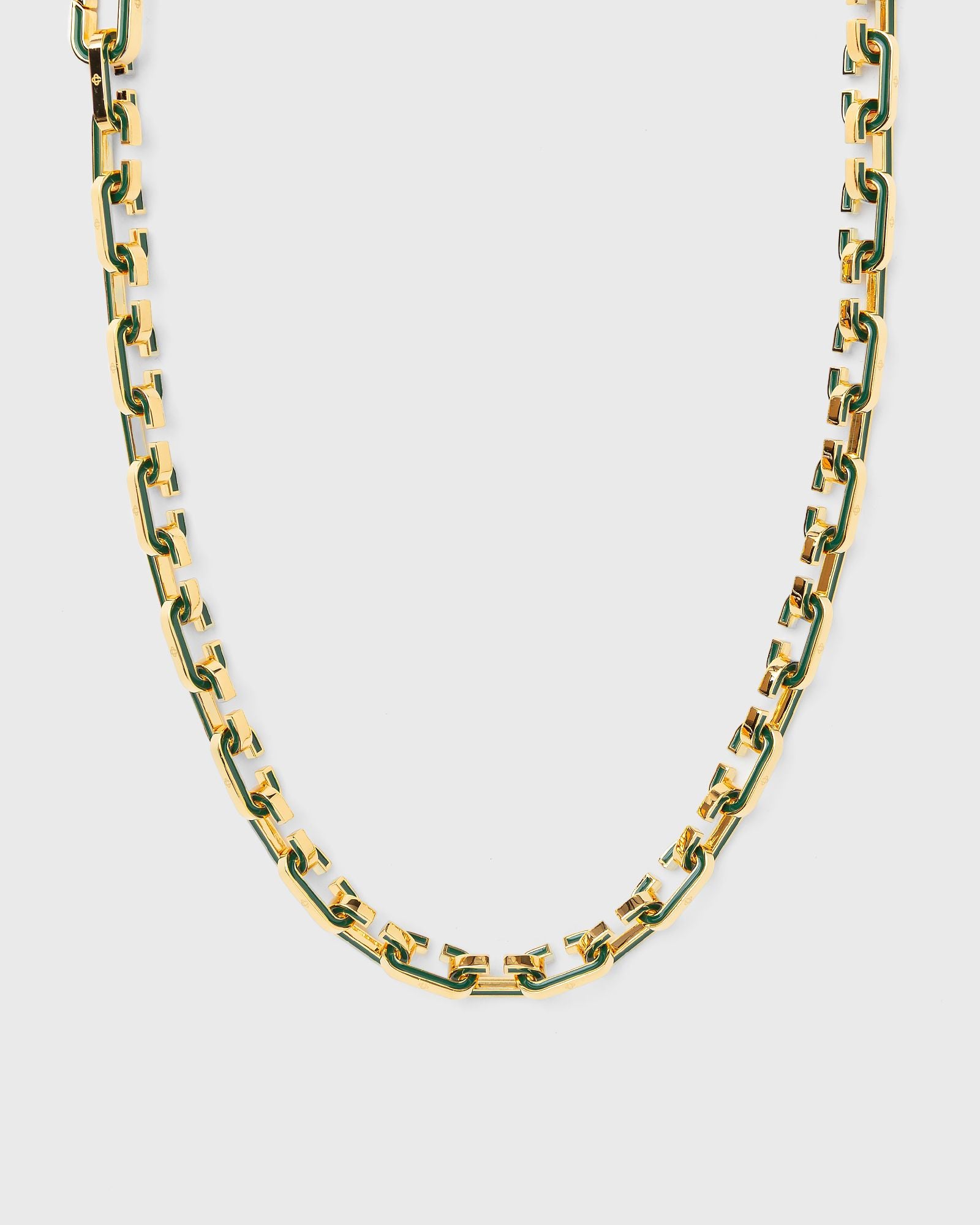 The Casablanca necklace with C-links is made of gold-plated brass and enamel. It is rounded off by a gold-plated chain with hand-painted green C-links made of enamel. - Brass and enamel