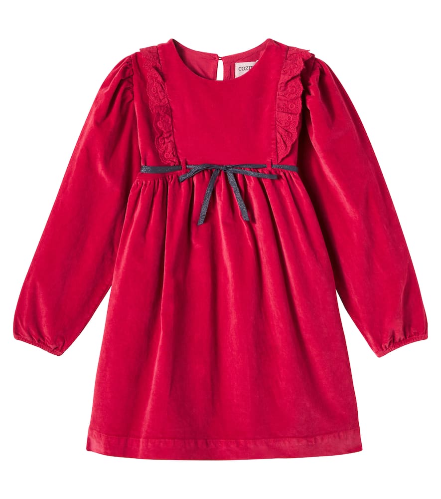 The Cozmo Osaka ruffled cotton velour dress is expertly crafted using material: 98% cotton, 2% elastane. care instructions: machine wash at 30 degrees. made in spain. designer color name: red velvet. item color: red. lining: 100% cotton. closure: buttoned back. cuff: elasticated. detachable belt. cotton. — ensuring durability and an unmistakable touch of elegance. Its meticulous construction speaks to Cozmo’s dedication to quality and distinctive design.