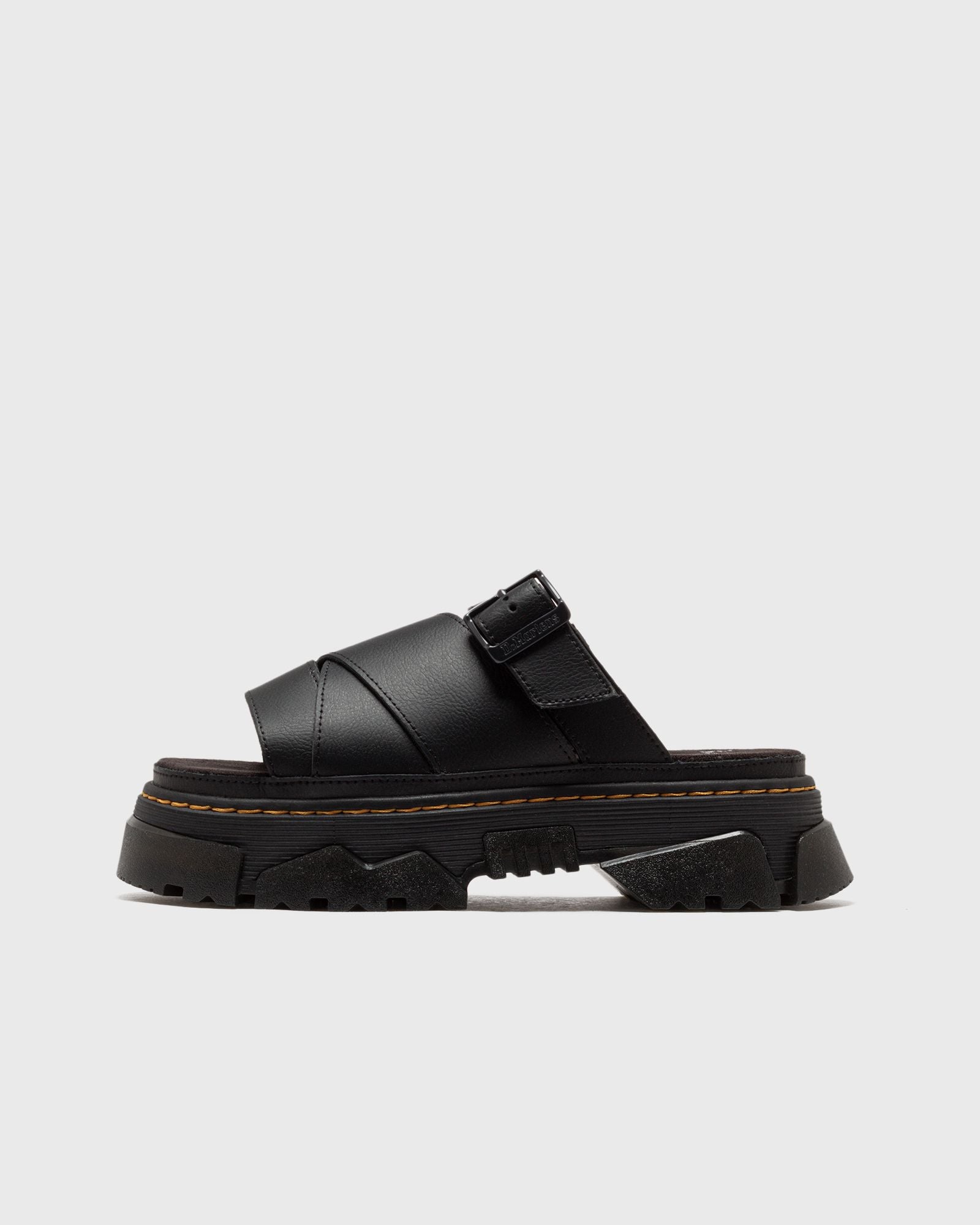 The Dr. Martens Mattison slide sandal is built on the unmissable new Mattison platform sole. The hybrid sole has a comfortable EVA midsole and a distinctive PVC tread that runs up the sidewalls creating a jagged pattern. The sole also features DM's signature grooves and yellow stitching. The suede-covered foam footbed provides extra cushioning on long days, and an adjustable strap helps secure the perfect fit. - Smooth, shrink-resistant PU-coated leather with a matte finish - Goodyear welt seams are heat-sealed and reinforced with signature welt stitching