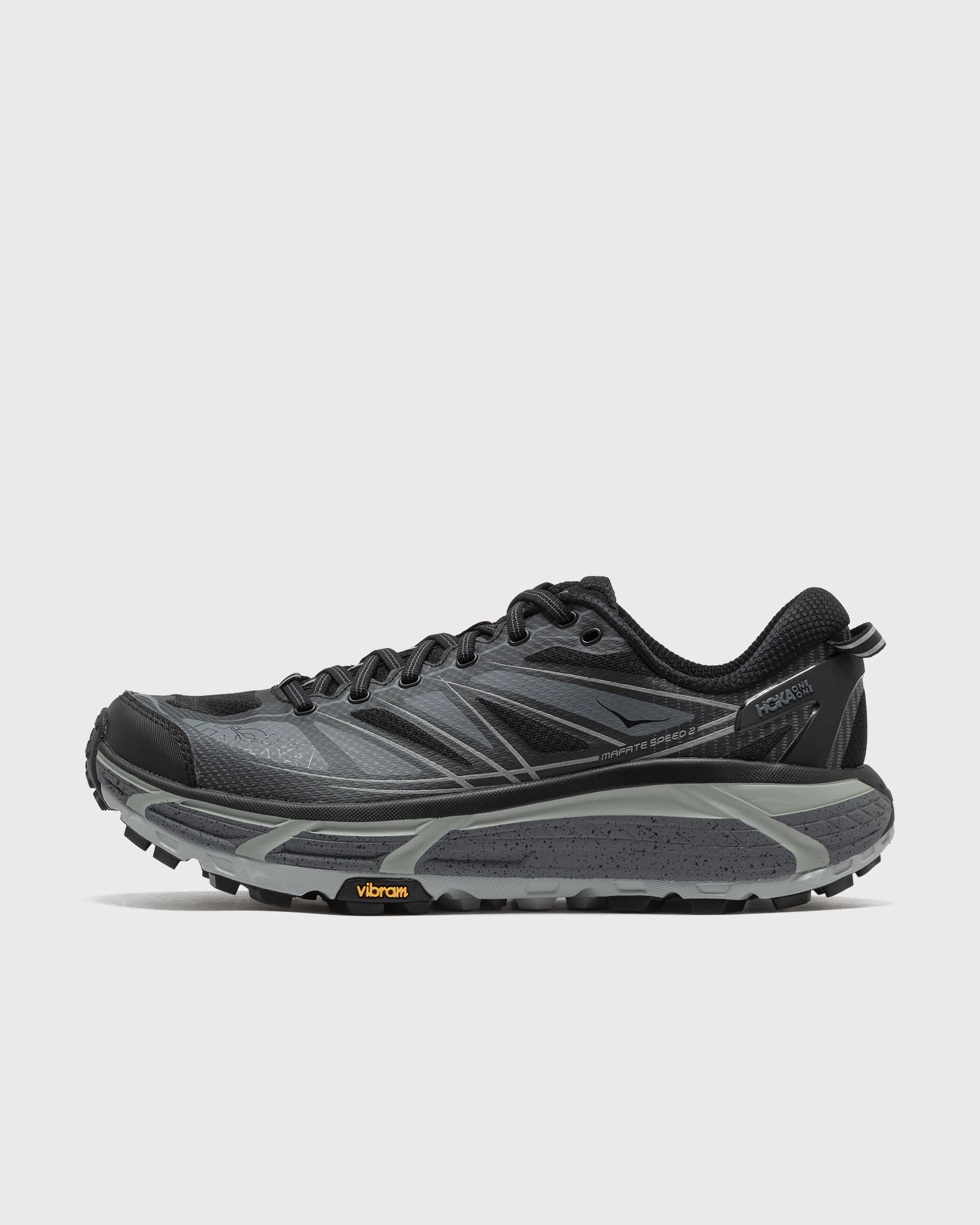 The HOKA Mafate Speed 2 is a lightweight trail and hiking shoe for all genders. It offers support and cushioning in technical terrain over any distance. The shoe features a deep Active Foot Frame for support and a tuned Meta-Rocker to facilitate smooth transitions through the gait cycle. The outsole utilizes deep flex grooves to adapt to a variety of terrain and the 5mm Vibram megagrip tread grips even the trickiest surface.