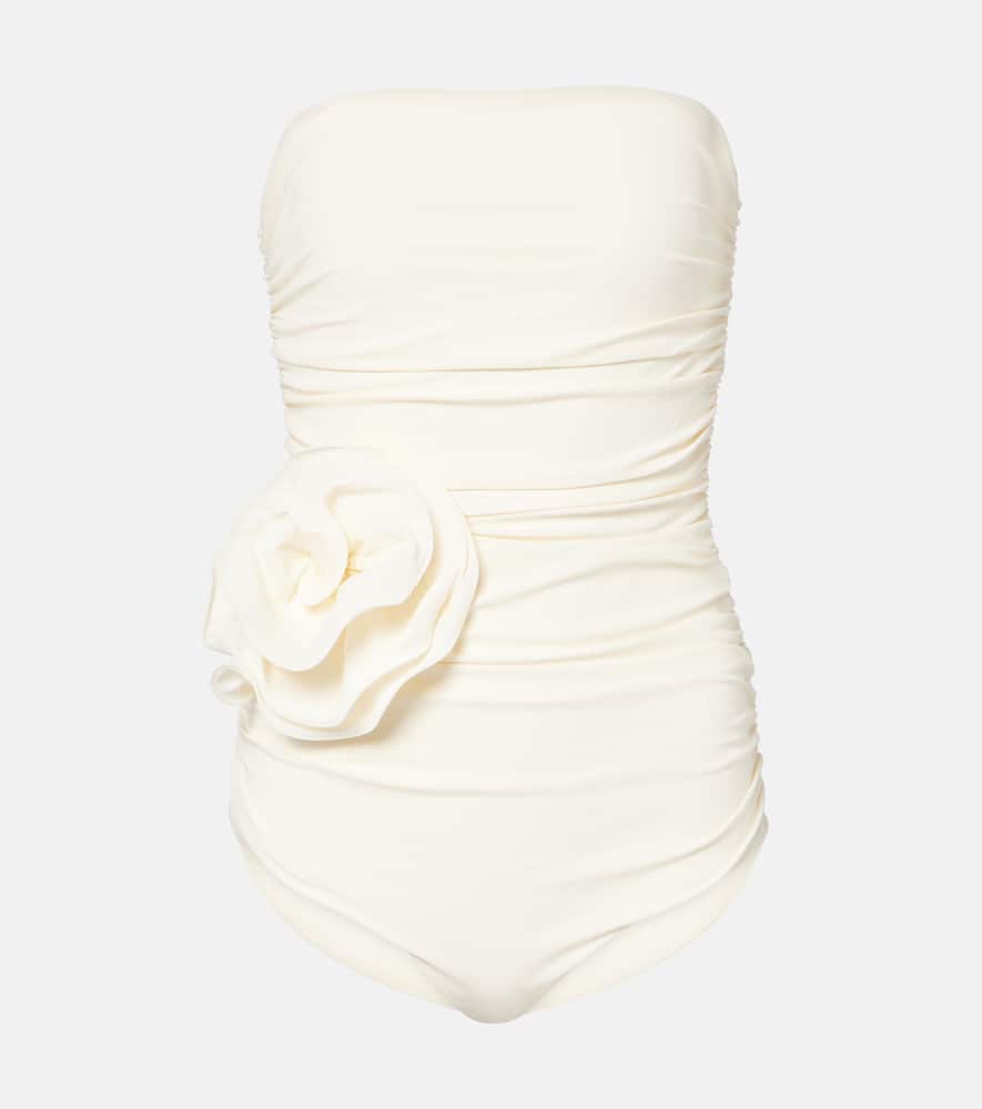The Magda Butrym Floral-applique ruched swimsuit is expertly crafted using material: 75% polyamide, 25% elastane. care instructions: hand wash. made in italy. designer color name: cream. — ensuring durability and an unmistakable touch of elegance. Its meticulous construction speaks to Magda Butrym’s dedication to quality and distinctive design.