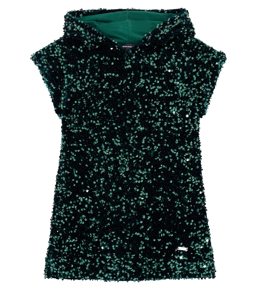 The Monnalisa Sequined jersey dress is expertly crafted using material: 90% polyethylene, 10% polyester. care instructions: hand wash. made in china. designer color name: verde bosco. item color: green. lining: 96% polyester, 4% elastane. hood. sleeves: short-sleeved. — ensuring durability and an unmistakable touch of elegance. Its meticulous construction speaks to Monnalisa’s dedication to quality and distinctive design.