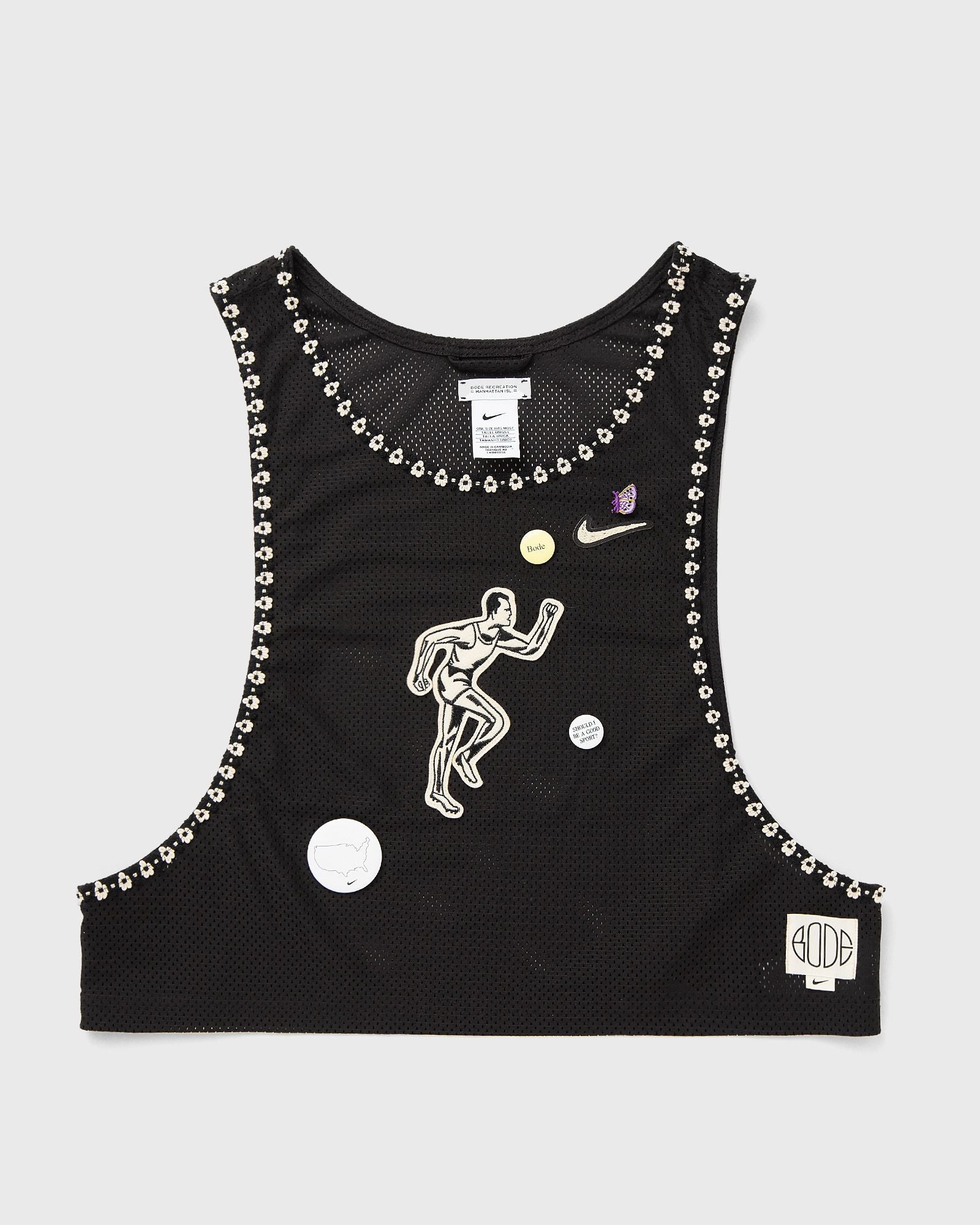 With the Nike x Bode Rec Scrimmage Pinny, Emily Bode Aujla revives vintage sports aesthetics: satin-embroidered felt appliqus, delicate floral borders and removable button pins meet lightweight mesh structure. - Breathable mesh - Felt appliqu - Removable pins